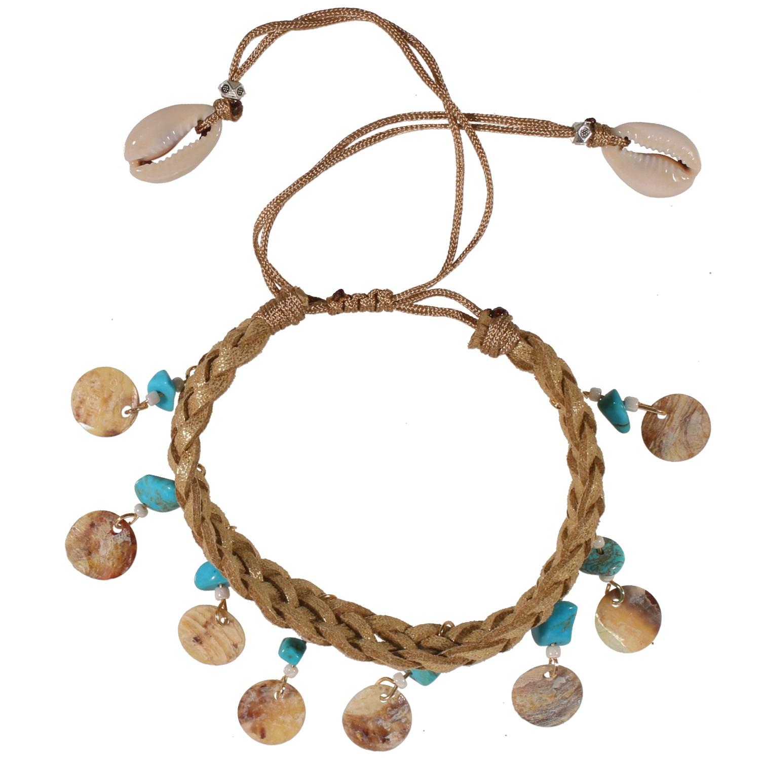 Bracelet/Chaîne cheville fantaisie en suédine, textile, métal, métal doré, coquillage et résine.