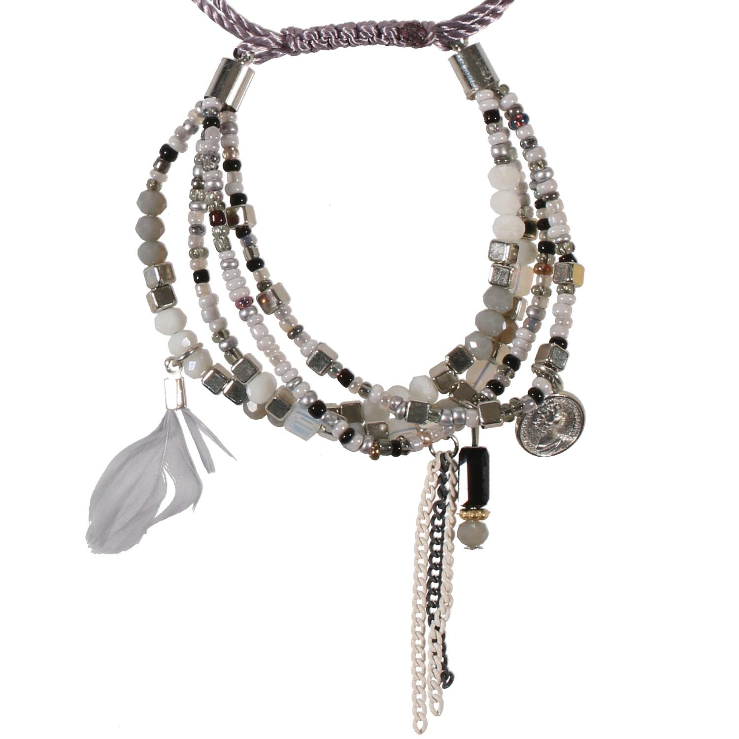Bracelet fantaisie en métal argenté, métal peint, plume, textile, rocaille et résine.