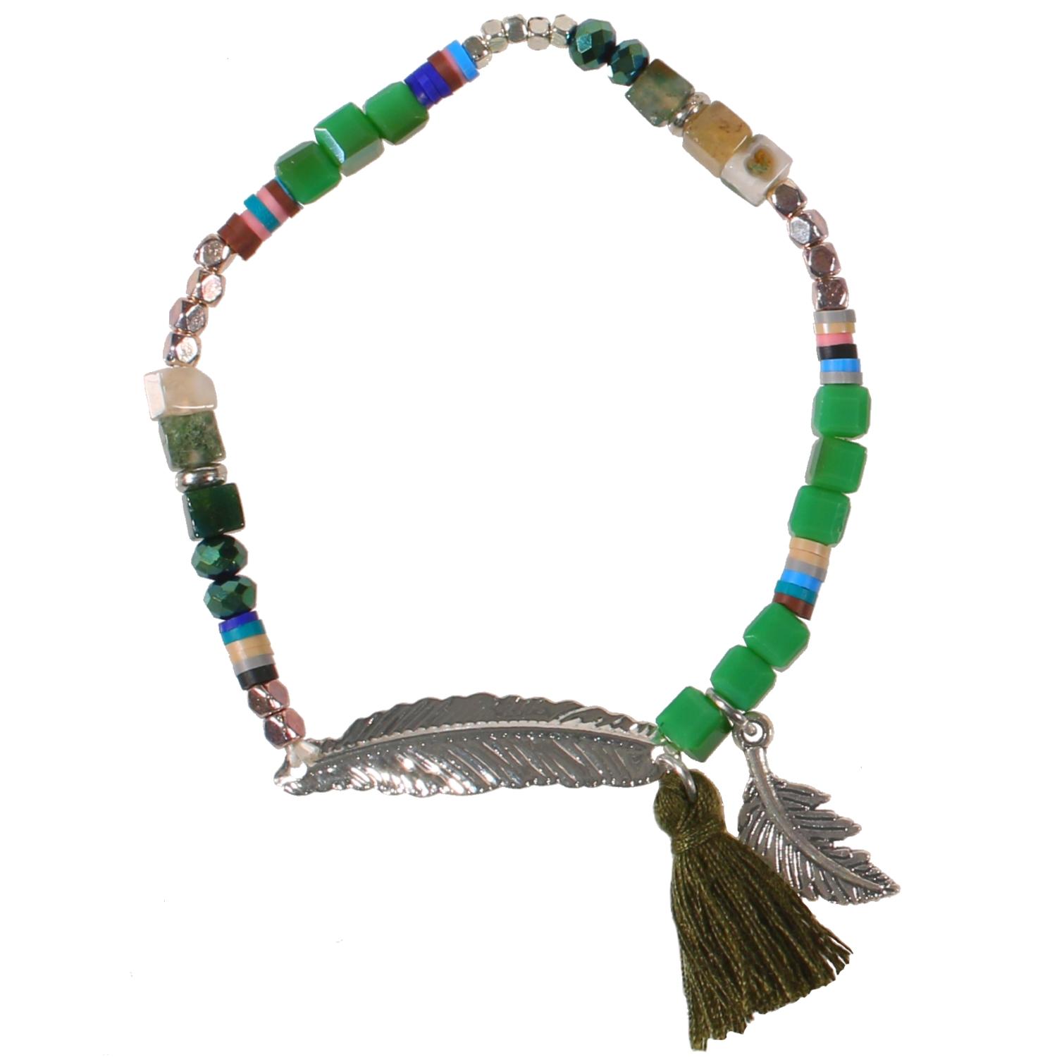 Bracelet fantaisie en métal argenté, résine, rocaille, caoutchouc et textile.