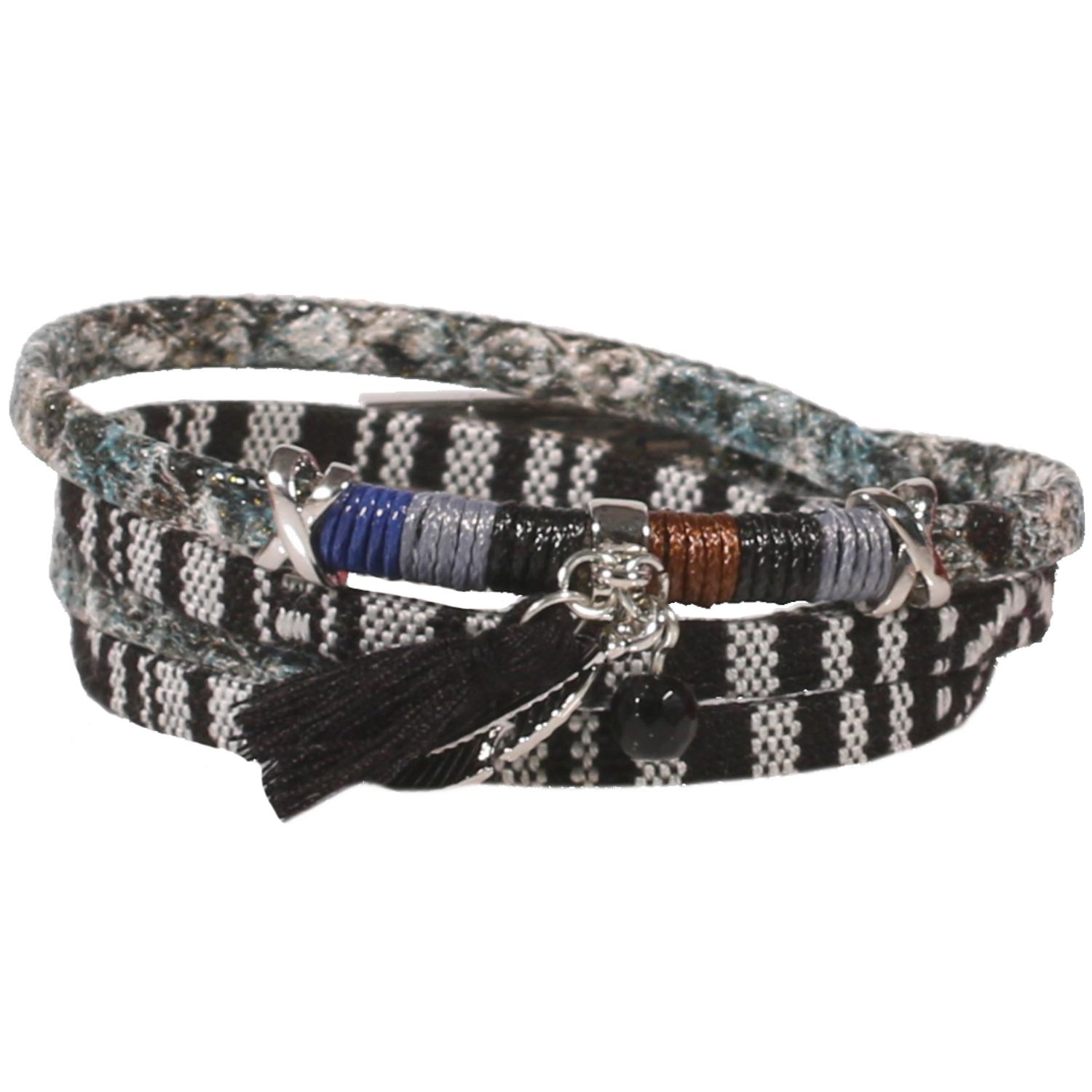 Bracelet fantaisie en suédine, textile, métal argenté et résine.