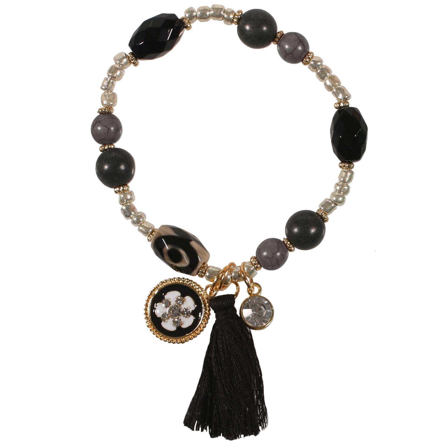 Bracelet fantaisie en métal doré, métal peint, résine, cristaux synthétiques et textile.