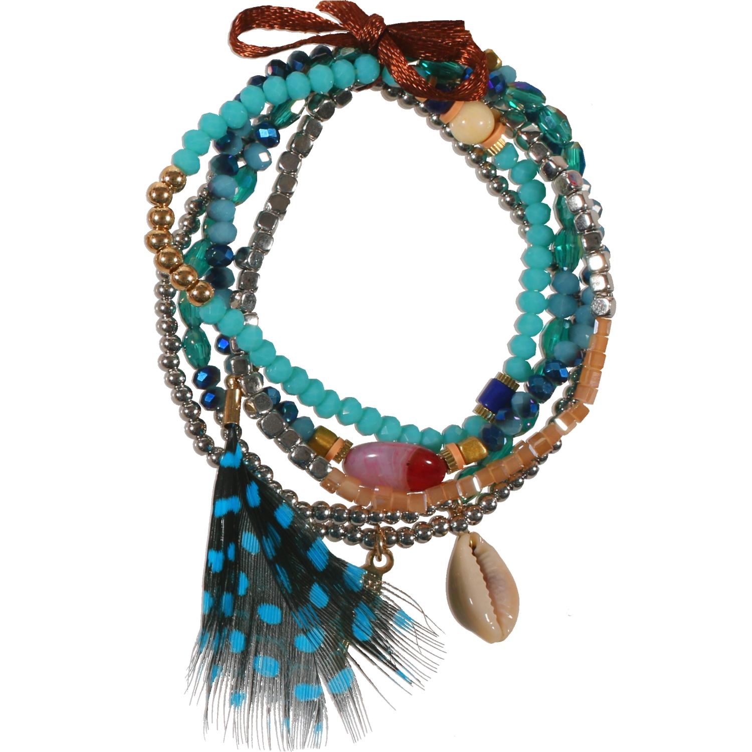 Lot de 5 bracelets en métal doré, métal argenté, rocaille, résine, textile et plume.