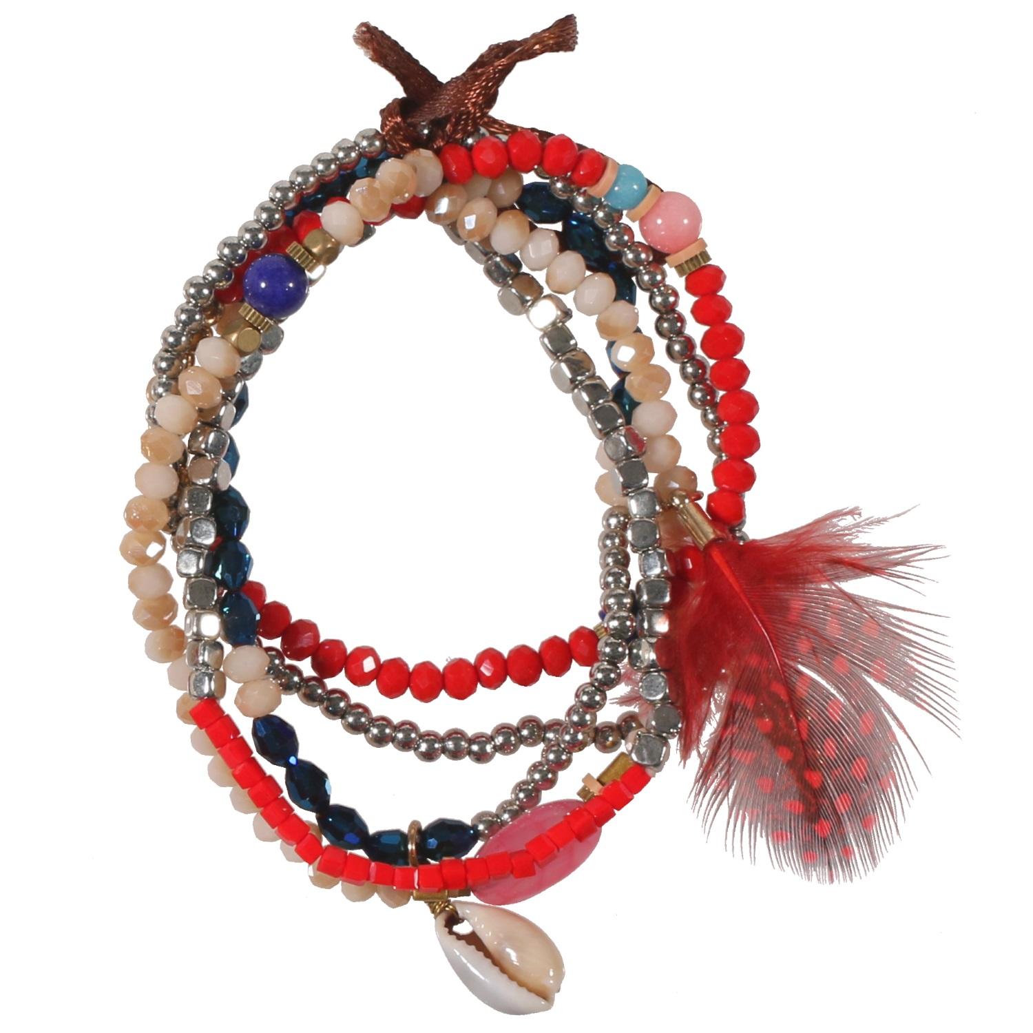 Bracelet fantaisie en métal doré, métal argenté, rocaille, résine, coquillage, textile et plume.