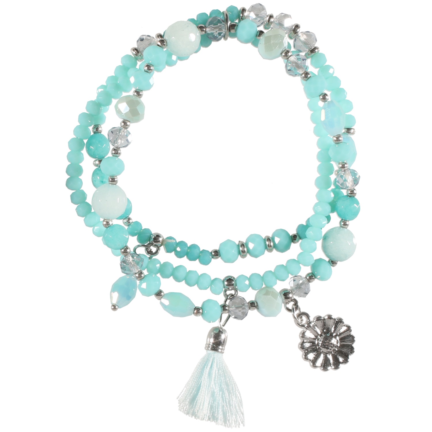 Lot de 3 bracelets fantaisie élastique liés par un anneau en métal argenté, perles en métal argenté, perles et cristaux de couleur, breloques fleur en métal argenté et pompon en textile.