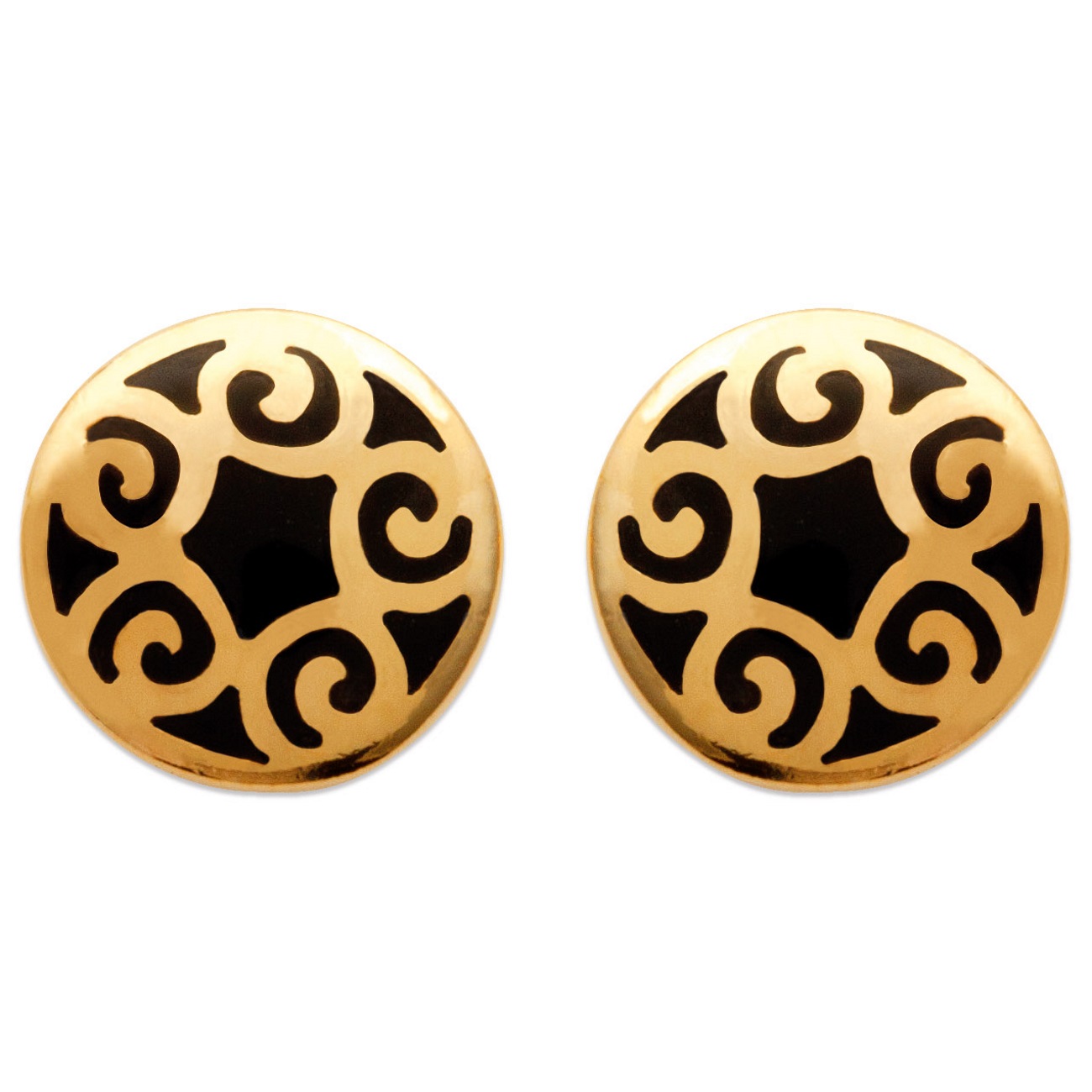 Boucles d'oreilles rondes en plaqué or jaune 18 carats et en résine noire avec motifs géométriques.