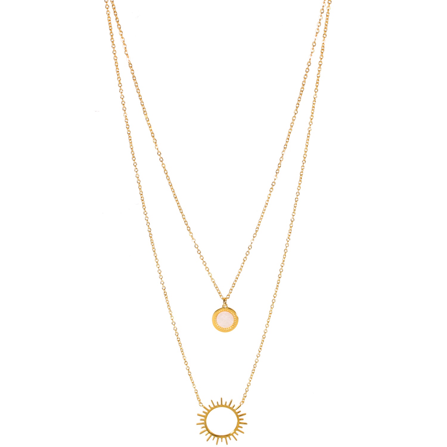Description Collier double rangs avec deux pendentifs en acier doré et nacre. Cliquez sur une matière, un thème, une couleur ou une collection pour voir tous les articles associés.