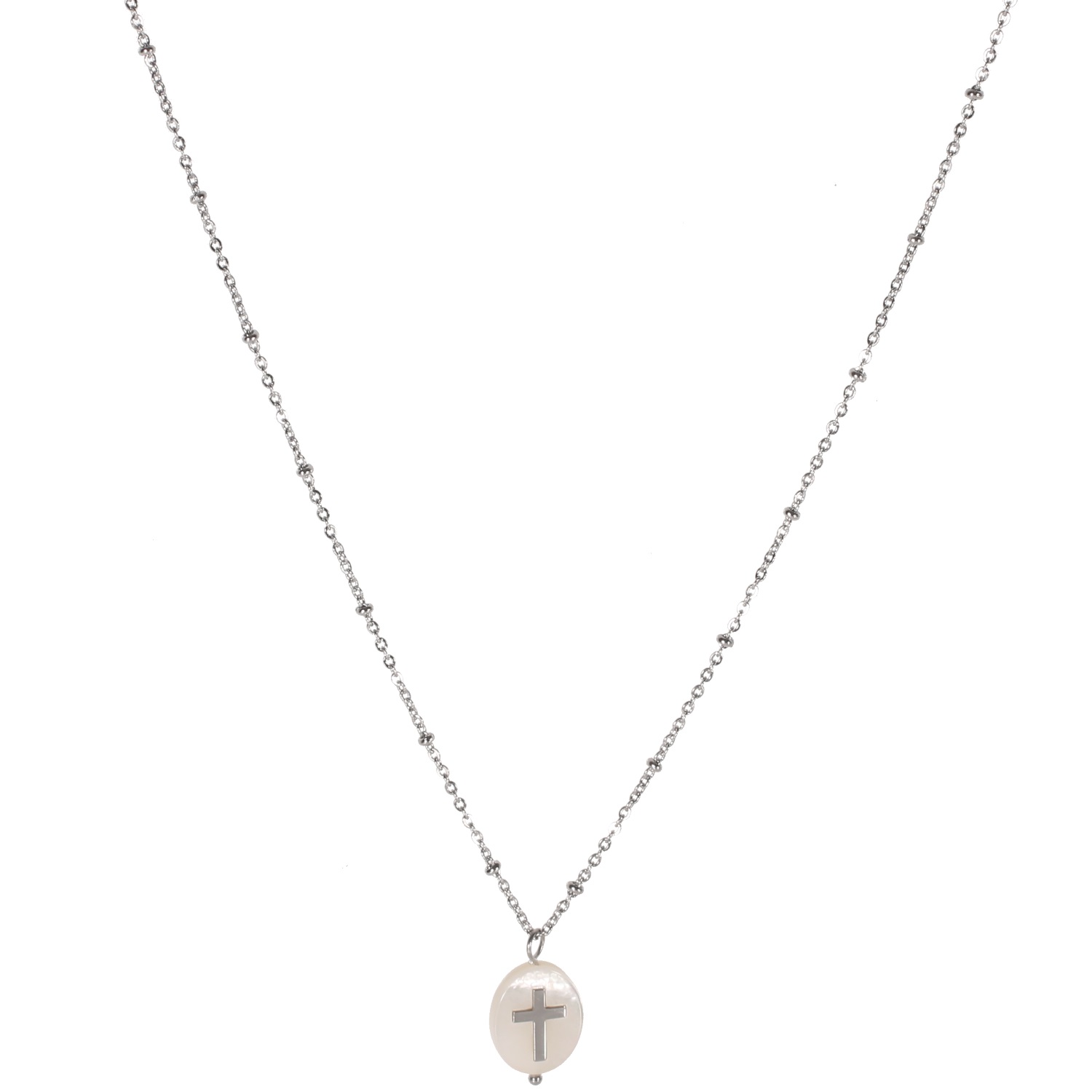 Collier en acier argenté et pendentif ovale en nacre et croix en acier argenté.