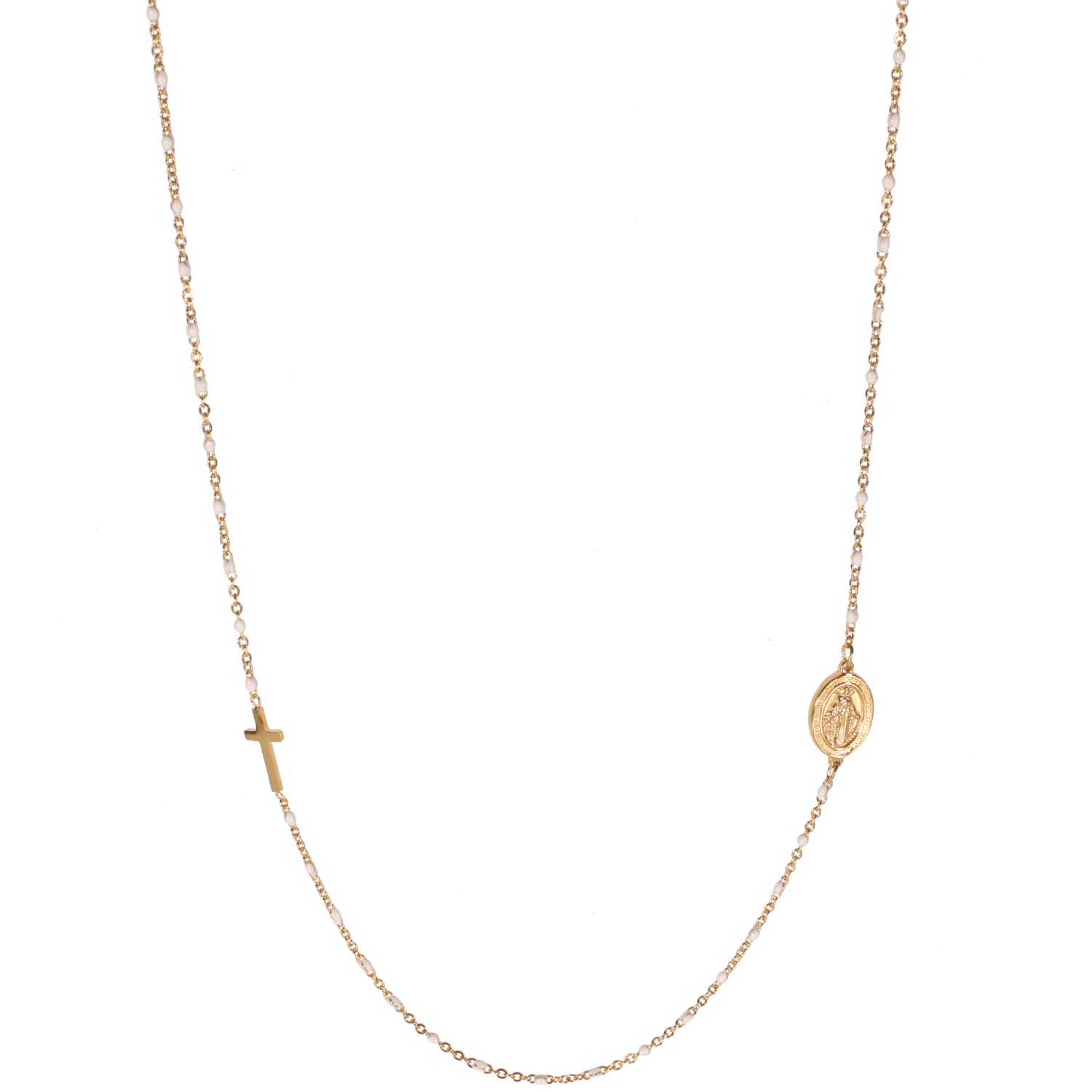 Description Collier avec croix et médaillon de la Vierge en acier doré et perles en émail. Cliquez sur une matière, un thème, une couleur ou une collection pour voir tous les articles associés.