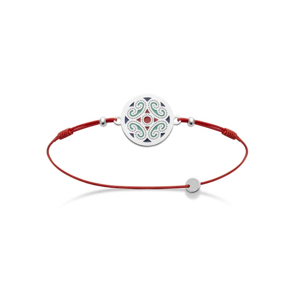 Bracelet avec cordon élastique en coton et pastille en argent 925/000 rhodié avec motif en émail.