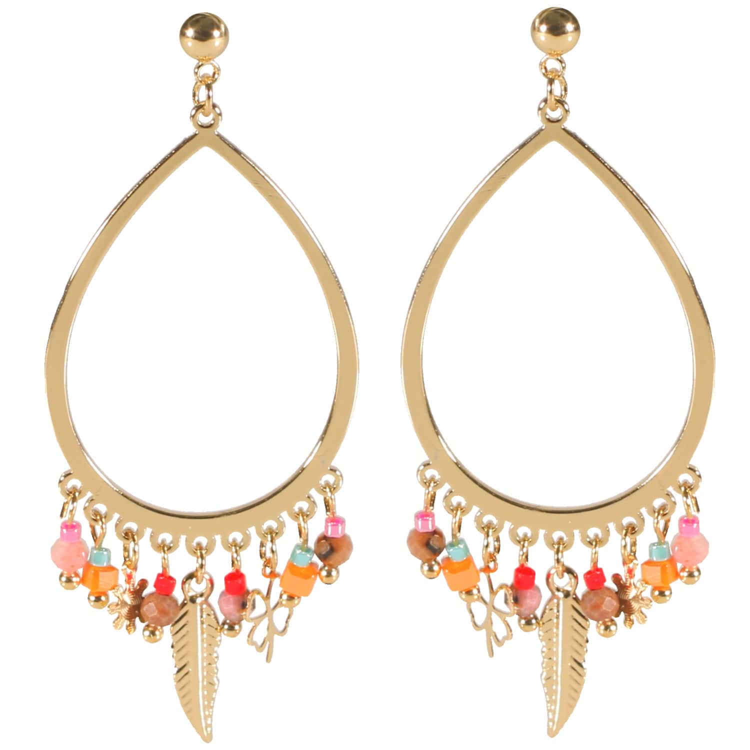 Boucles d'oreilles pendantes avec cercles ovales et pendants plume, trèfles à quatre feuilles et fleurs en acier doré et perles de couleur.