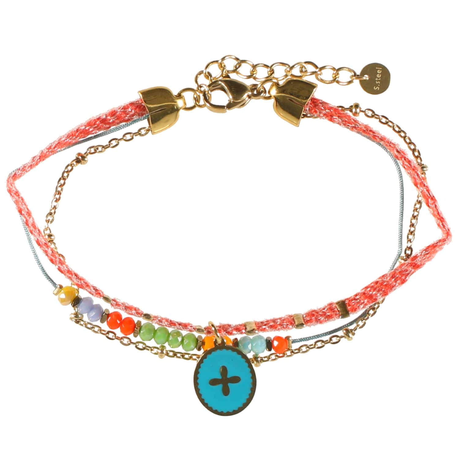 Bracelet triple rangs composé d'une chaîne en acier doré, un cordon en coton de couleur avec perles de couleur, ainsi qu'un cordon en textile avec une médaille ovale et le motif d'une croix en acier doré et émail.