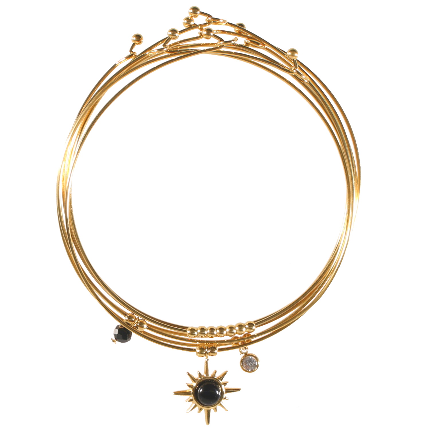Ensemble de 7 bracelets jonc fil rond et fin avec perles en acier doré, une perle de couleur noire, un cristal serti clos et une étoile en acier doré sertie clos d'une pierre de couleur noire.