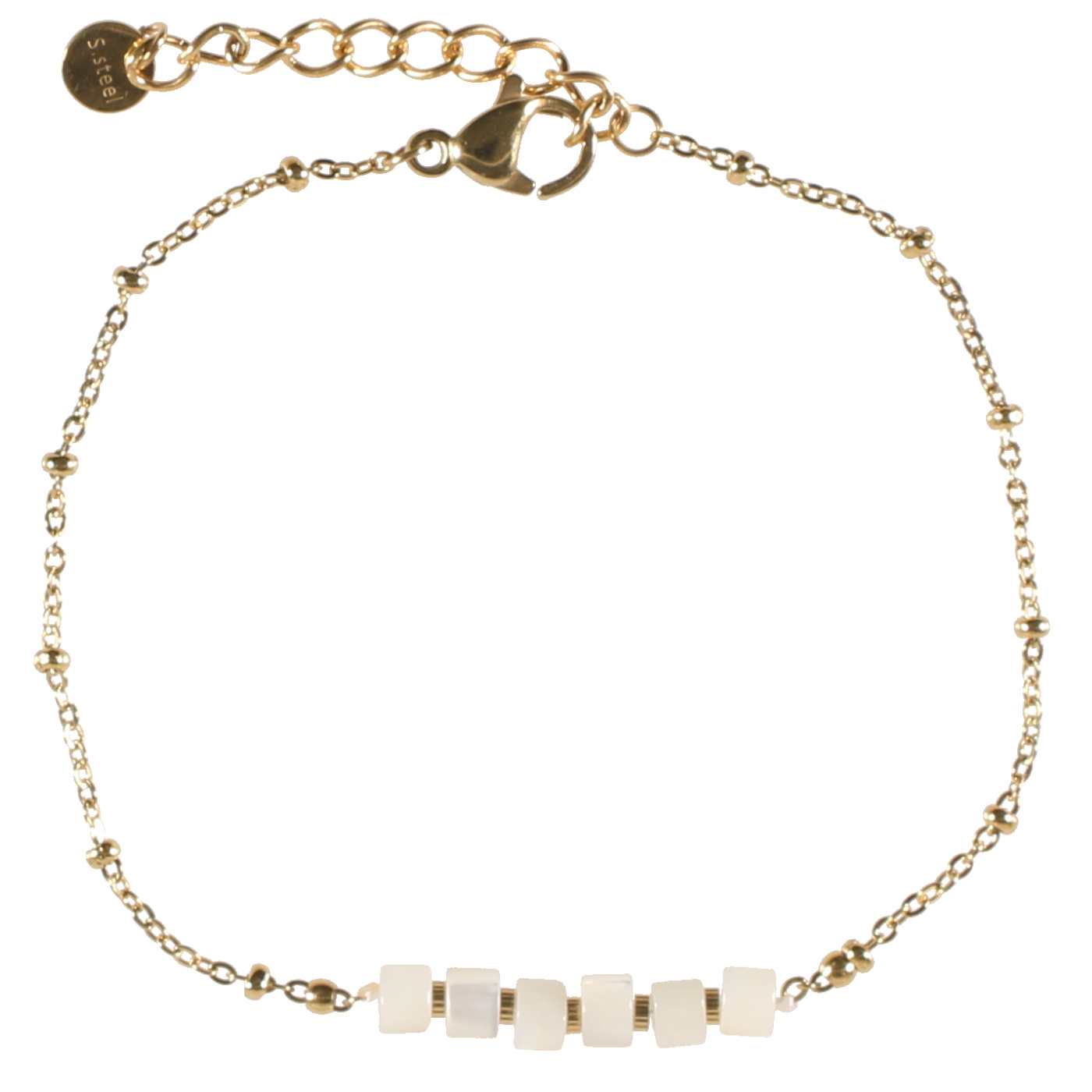 Description Bracelet composé d'une chaîne en acier doré avec perles cylindriques en nacre. Fermoir mousqueton avec 3 cm de rallonge. Longueur 16+3 cm [Guide des tailles] Largeur 3 mm Matière(s) Acier , Nacre . L'acier utilisé dans la bijouterie existe sous plusieurs qualités. Nous utilisons principalement la qualité 316L, qualité qui est utilisée en chirurgie. Cet acier est donc inoxydable et reste très résistant. Fermoir Mousqueton Couleur(s) dominante(s) Blanc , Doré Public Adolescent , Adulte . Genre Femme , Fille . Saison Indémodable . Cliquez sur une matière, un thème, une couleur ou une collection pour voir tous les articles associés.