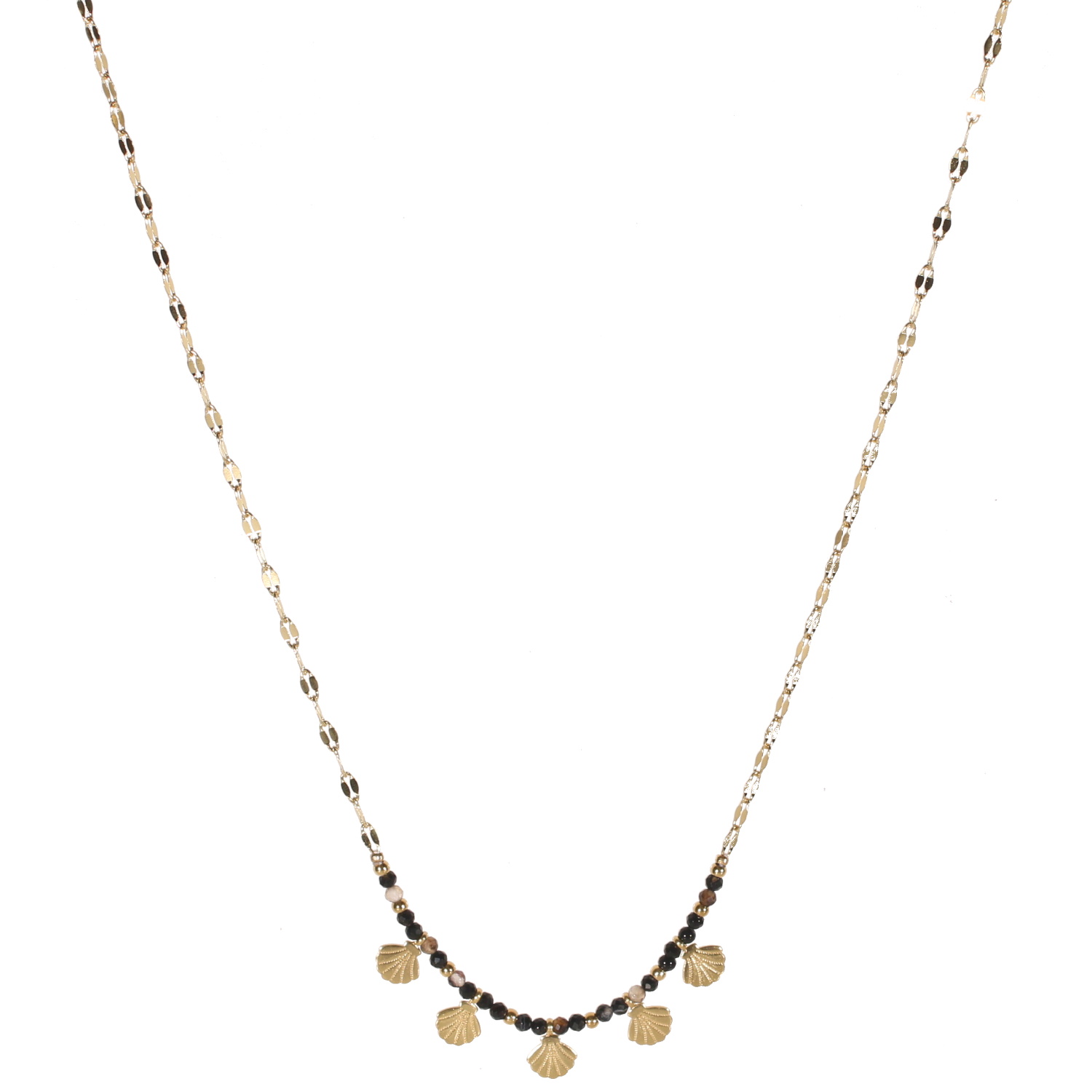 Collier composé d'une chaîne avec pampilles au motif de coquilles saint Jacques en acier doré surmontée de perles en véritables pierre d'agate noire.