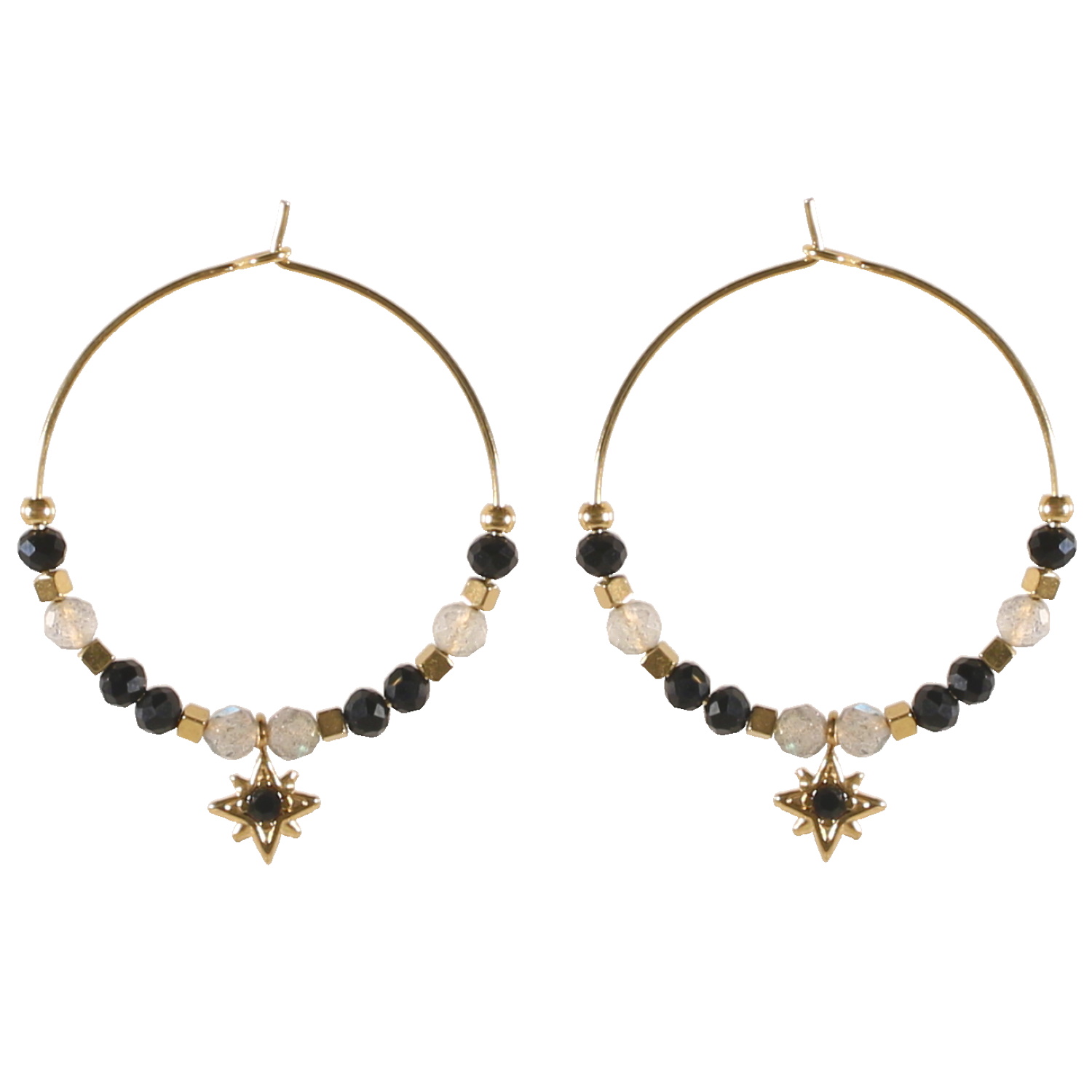 Boucles d'oreilles créoles en acier doré surmontées de perles de couleur noire et grise avec un pendant étoile en acier doré sertie d'un cristal noir.