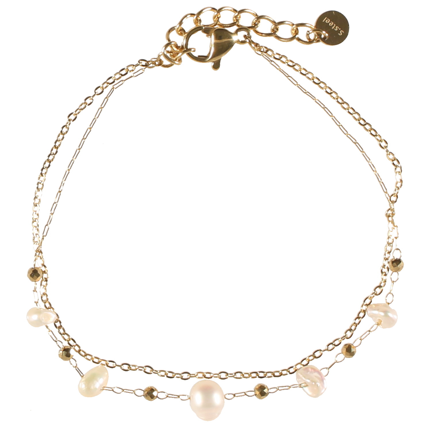 Description Bracelet double rangs composé d'une chaîne en acier doré, ainsi qu'une chaîne avec perles en acier doré et perles de nacre. Fermoir mousqueton avec 3 cm de rallonge. Longueur 16+3 cm [Guide des tailles] Largeur 6 mm Matière(s) Acier , Nacre . L'acier utilisé dans la bijouterie existe sous plusieurs qualités. Nous utilisons principalement la qualité 316L, qualité qui est utilisée en chirurgie. Cet acier est donc inoxydable et reste très résistant. Fermoir Mousqueton Couleur(s) dominante(s) Blanc , Doré Public Adolescent , Adulte . Genre Femme , Fille . Saison Indémodable . Cliquez sur une matière, un thème, une couleur ou une collection pour voir tous les articles associés.