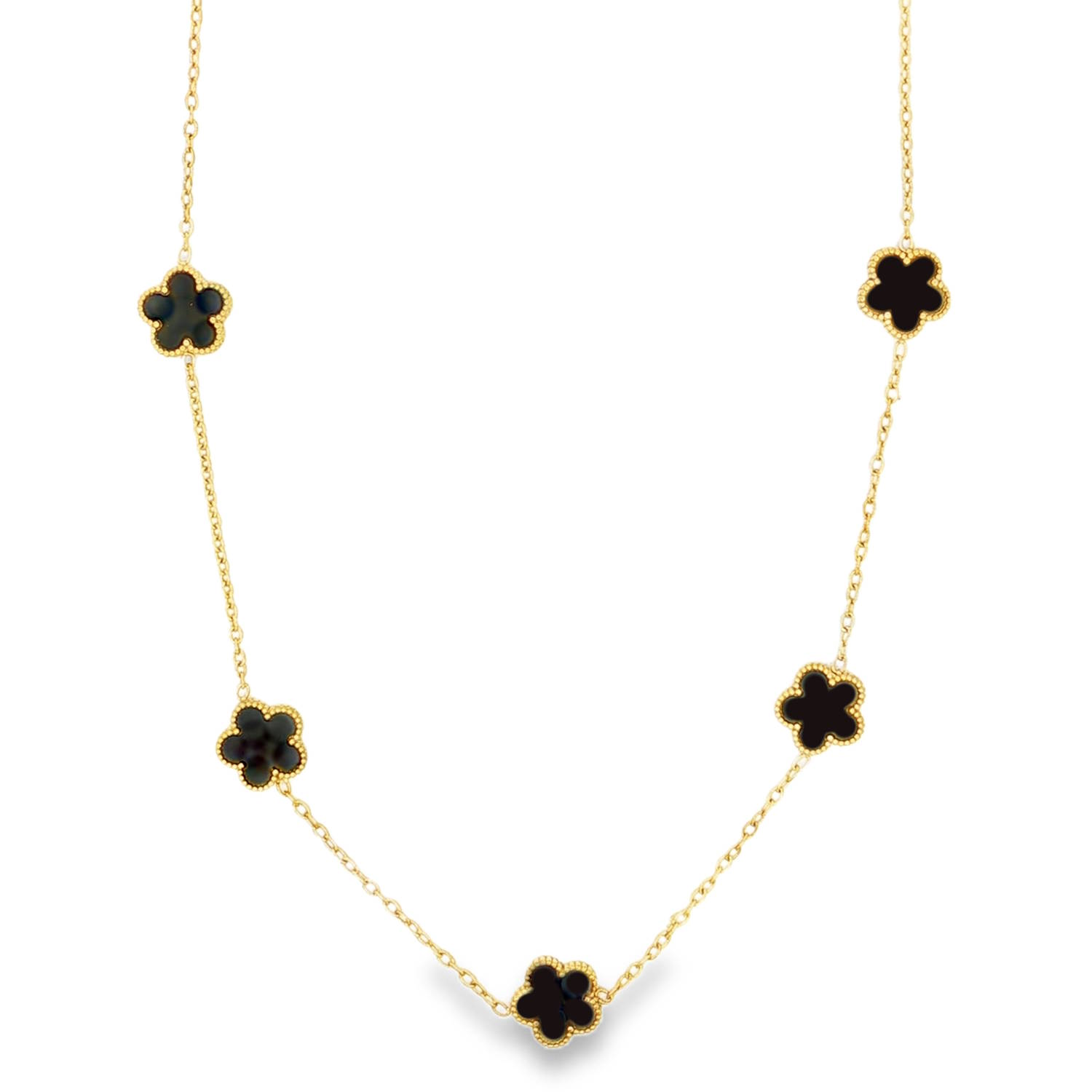 Le bijou se compose d'une chaîne fine en maille forçat, prisée pour sa discrétion et sa solidité. Le long de cette chaîne sont répartis harmonieusement cinq pendentifs fixes en forme de fleurs à cinq pétales.