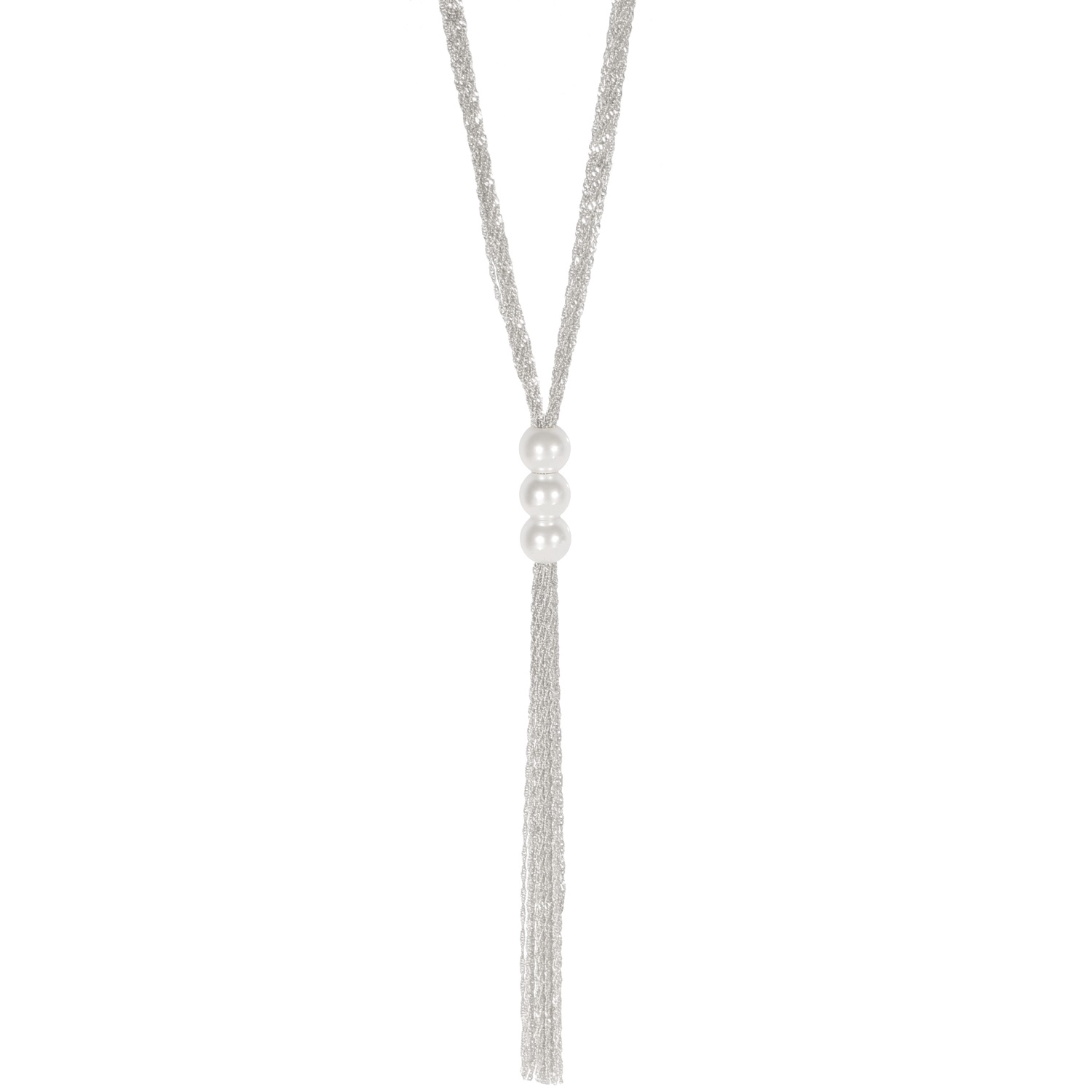 Collier sautoir fantaisie multi rangs en métal argenté et perles synthétiques.