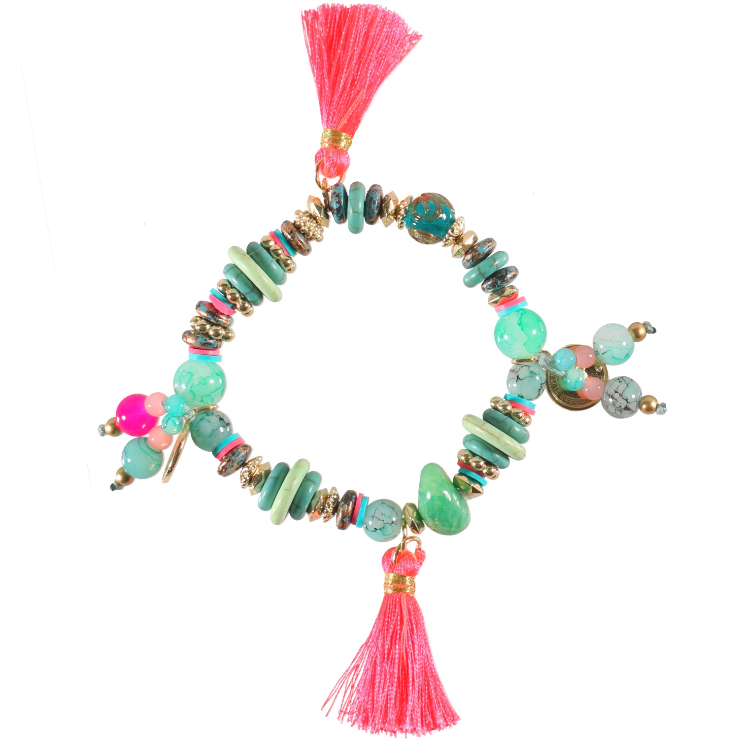Bracelet fantaisie élastique avec breloques pièces de monnaie en métal doré, perles et pierres de couleurs et pompons en textile.