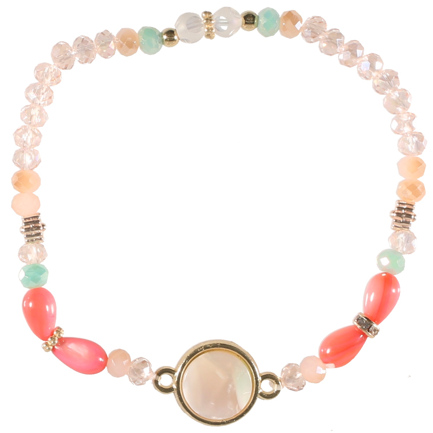 Bracelet fantaisie élastique en métal doré, perles de couleur et pierre de nacre colorée.