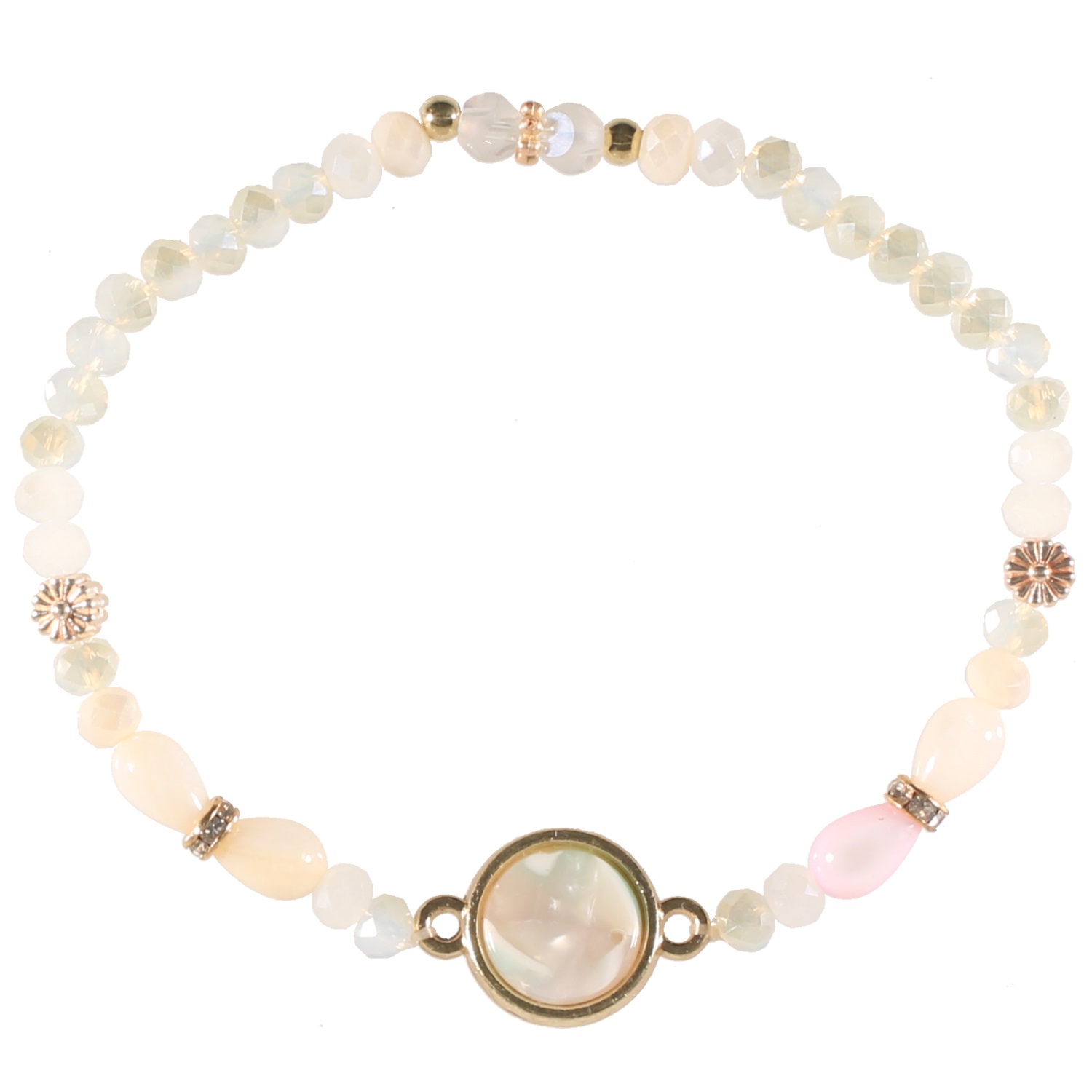 Bracelet fantaisie élastique en métal doré, perles de couleur et pierre de nacre colorée.