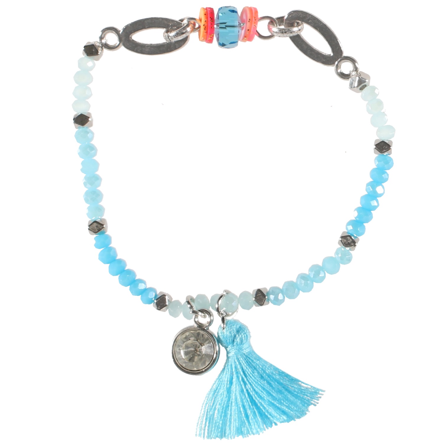 Bracelet fantaisie élastique avec anneaux et perles en métal argenté, perles de couleur, cristal serti clos et pompon en textile.