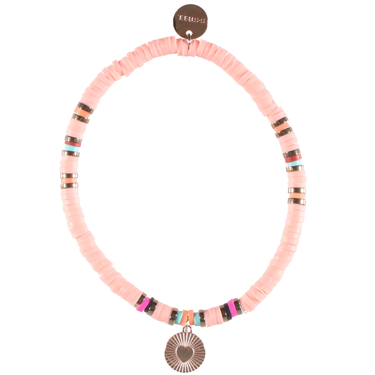 Bracelet élastique composé de perles cylindriques heishi en résine synthétique et caoutchouc de couleur et pendant rond au motif de cœur en acier rosé.