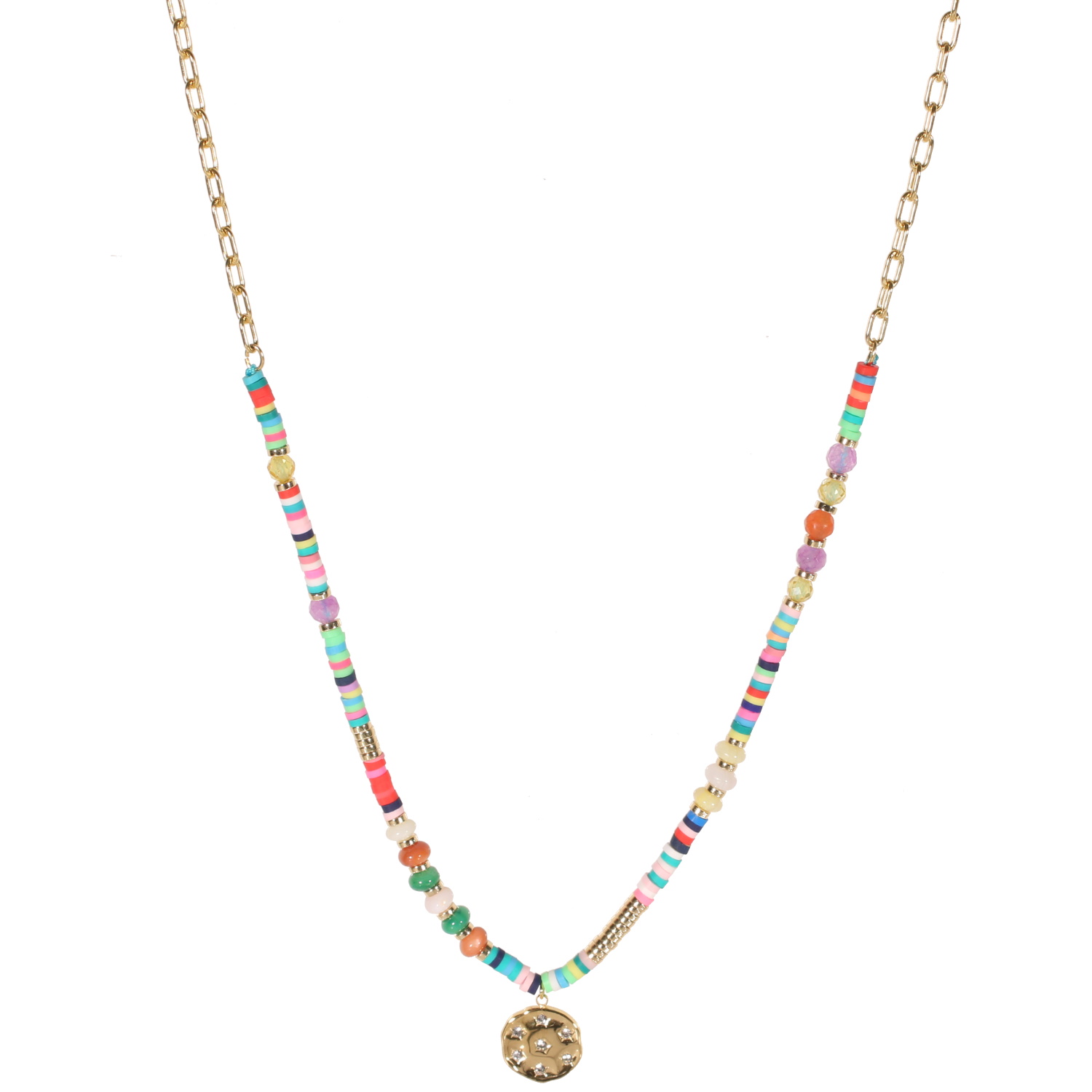 Collier composé d'une chaîne en acier doré et perles cylindriques heishi en résine synthétique et caoutchouc de couleur acidulée, ainsi qu'un pendentif rond en acier doré pavé de strass en forme d'étoiles.