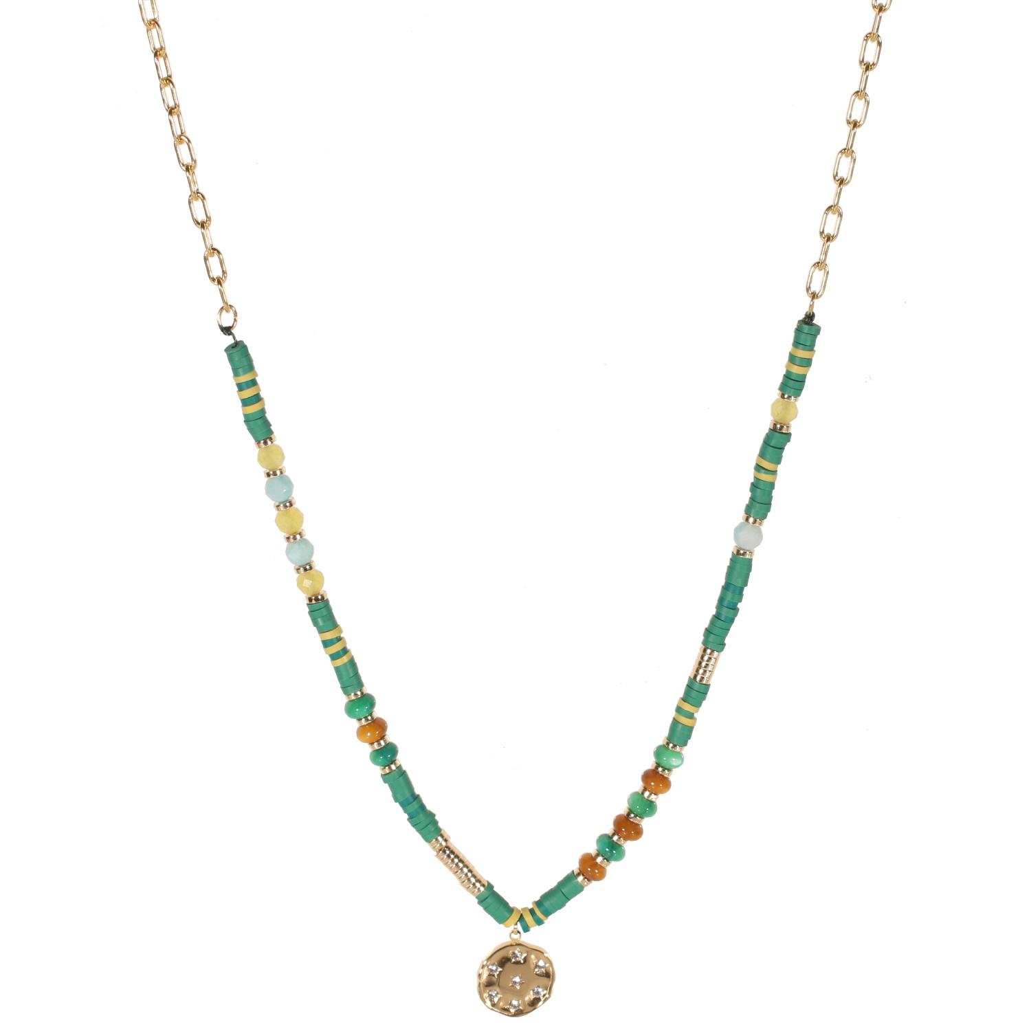 Collier composé d'une chaîne en acier doré et perles cylindriques heishi en résine synthétique et caoutchouc de couleur acidulée, ainsi qu'un pendentif rond en acier doré pavé de strass en forme d'étoiles.