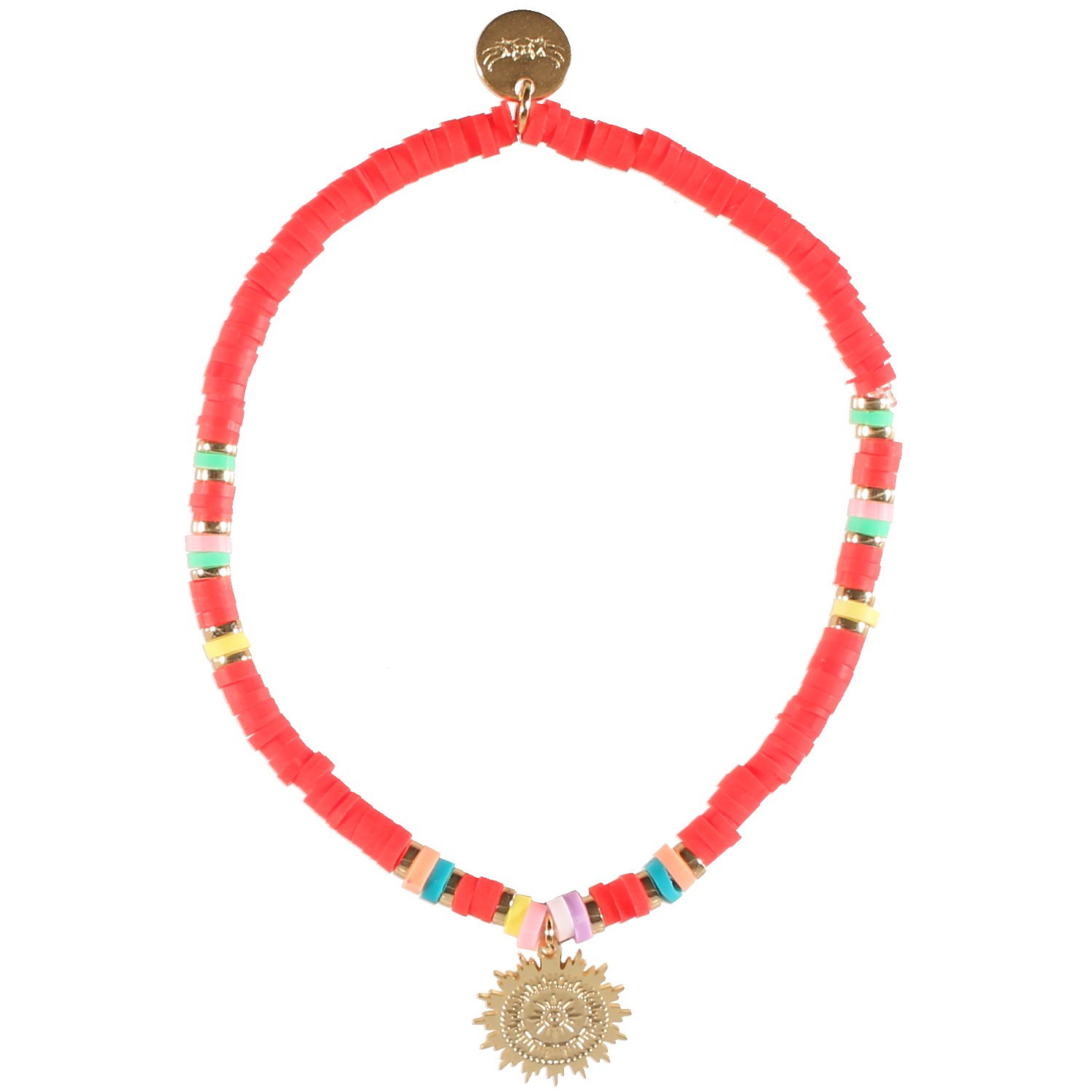 Description Bracelet élastique composé de perles heishi en acier doré et en caoutchouc multicolore et d'un pendant en forme de soleil en acier doré. Longueur 17 cm [Guide des tailles] Largeur 4 mm Matière(s) Acier , Caoutchouc . L'acier utilisé dans la bijouterie existe sous plusieurs qualités. Nous utilisons principalement la qualité 316L, qualité qui est utilisée en chirurgie. Cet acier est donc inoxydable et reste très résistant. Fermoir Aucun À noter Pendant 12 mm de diamètre Couleur(s) dominante(s) Doré , Rouge Public Adolescent , Adulte . Genre Femme , Fille . Saison Indémodable . Thème(s) Nature . Collection Heishi Cliquez sur une matière, un thème, une couleur ou une collection pour voir tous les articles associés.