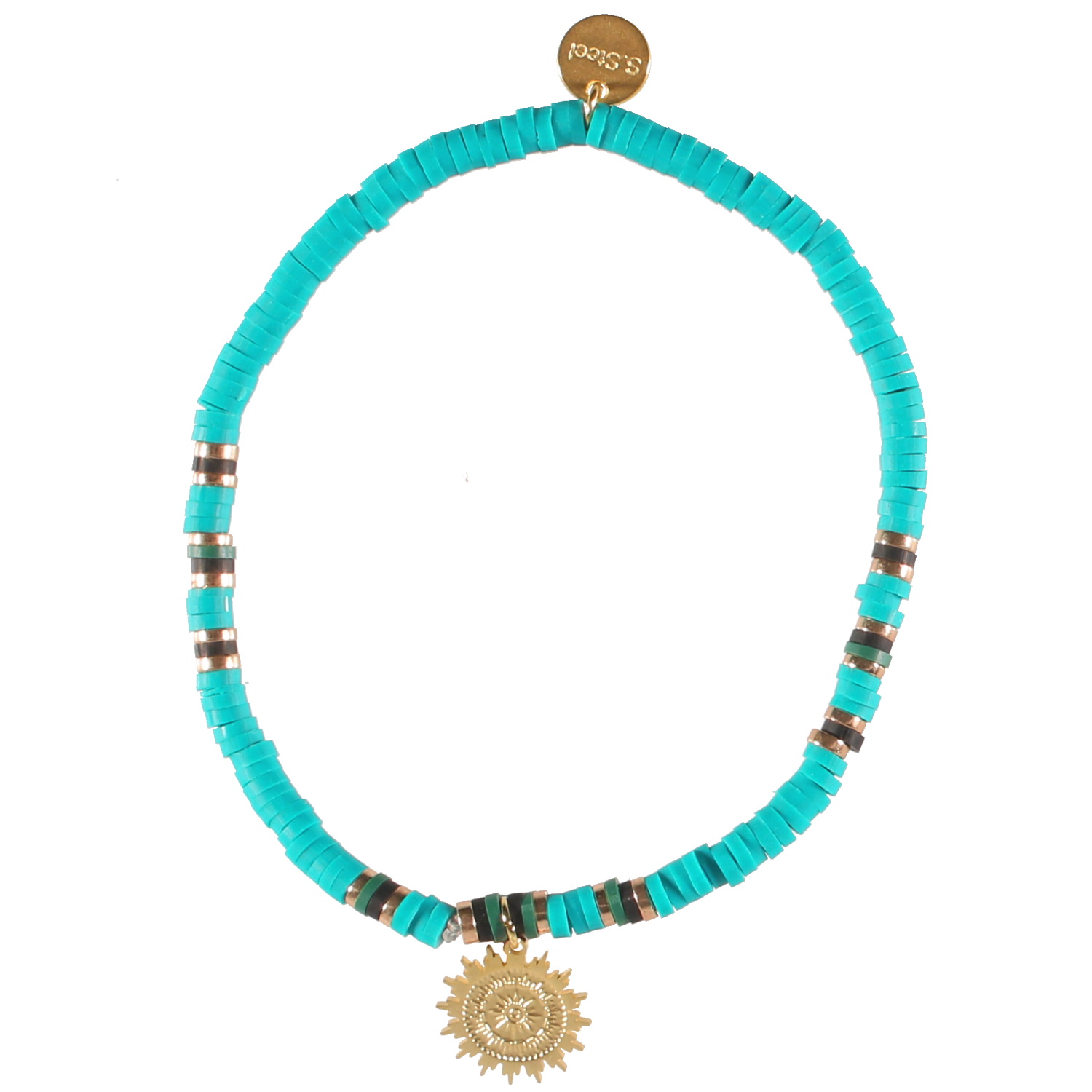 Description Bracelet élastique composé de perles heishi en acier doré et en caoutchouc multicolore et d'un pendant en forme de soleil en acier doré. Longueur 17 cm [Guide des tailles] Largeur 4 mm Matière(s) Acier , Caoutchouc . L'acier utilisé dans la bijouterie existe sous plusieurs qualités. Nous utilisons principalement la qualité 316L, qualité qui est utilisée en chirurgie. Cet acier est donc inoxydable et reste très résistant. Fermoir Aucun À noter Pendant 12 mm de diamètre Couleur(s) dominante(s) Doré , Vert Public Adolescent , Adulte . Genre Femme , Fille . Saison Indémodable . Thème(s) Nature . Collection Heishi Cliquez sur une matière, un thème, une couleur ou une collection pour voir tous les articles associés.