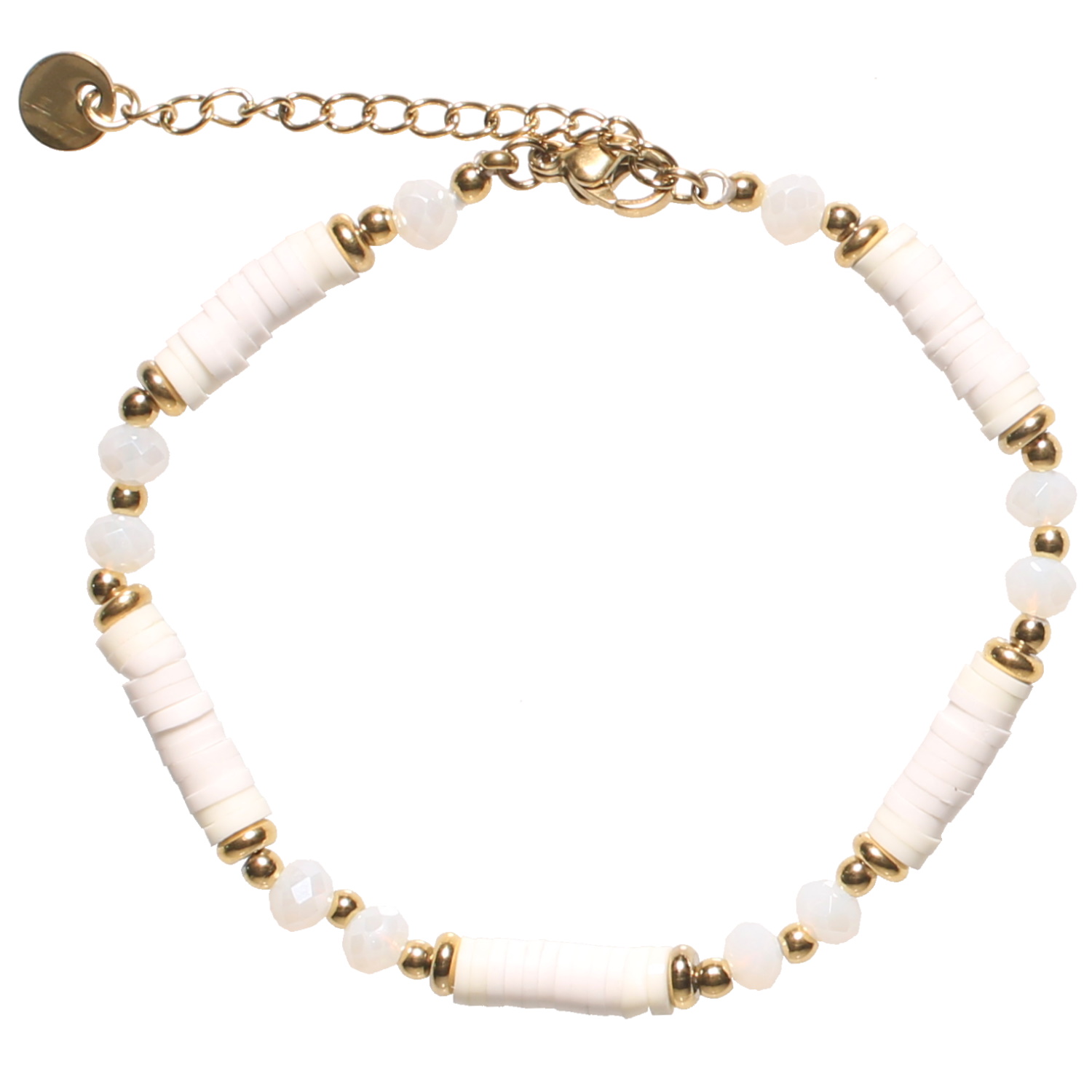 Description Bracelet fantaisie composé de perles heishi en acier doré, en résine synthétique et en caoutchouc de couleur blanche et de perles de couleur blanche. Fermoir mousqueton avec 3 cm de rallonge. Cliquez sur une matière, un thème, une couleur ou une collection pour voir tous les articles associés.