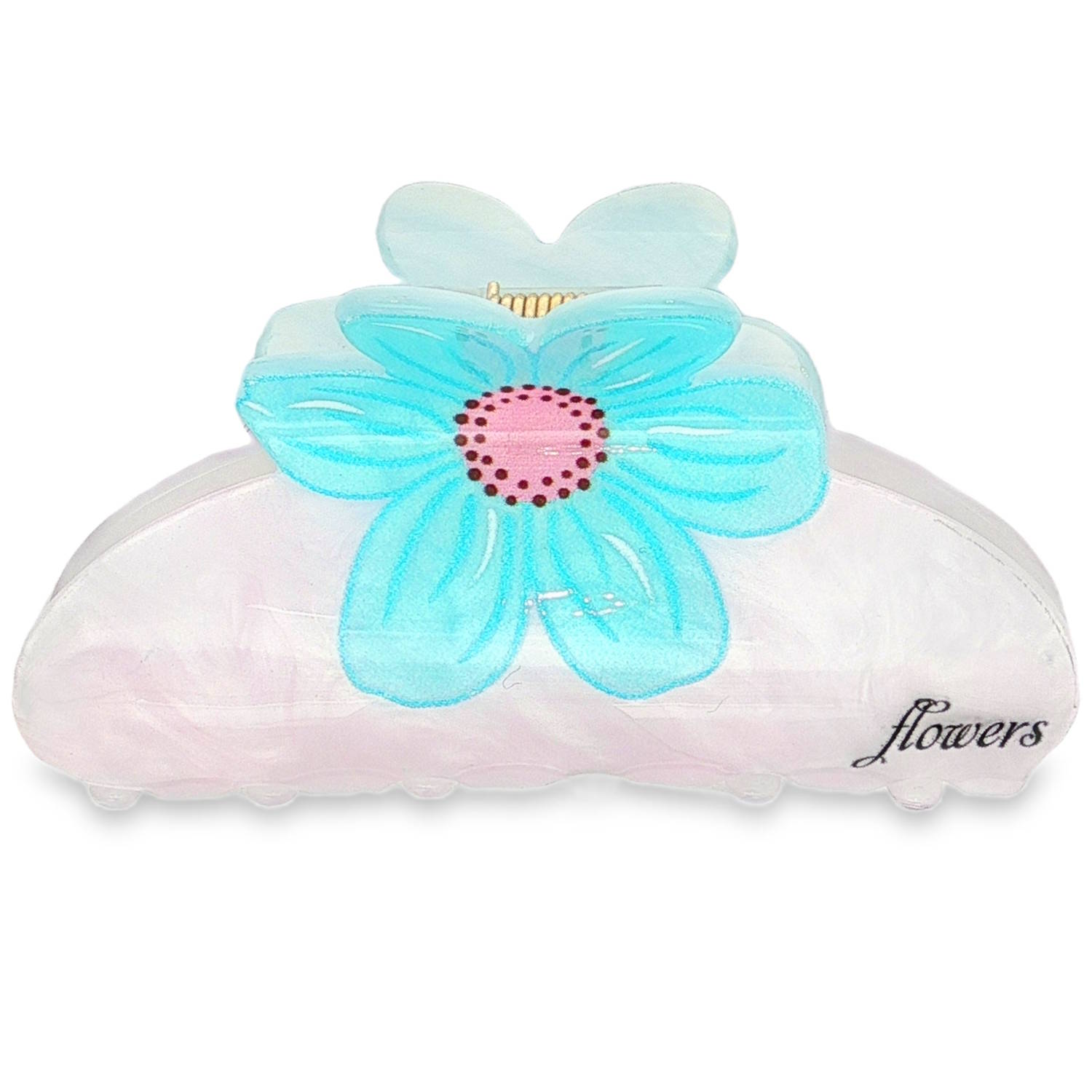 Description Cette pince à cheveux dégage un style printanier et rafraîchissant. La base présente une finition nacrée et irisée, oscillant entre le blanc et le rose très pâle, rappelant la nacre d'un coquillage. Elle est ornée d'une fleur centrale aux pétales d'un bleu turquoise vibrant. Le cœur de la fleur est d'un rose doux, parsemé de petits points sombres pour un effet réaliste et contrasté. Cliquez sur une matière, un thème, une couleur ou une collection pour voir tous les articles associés.