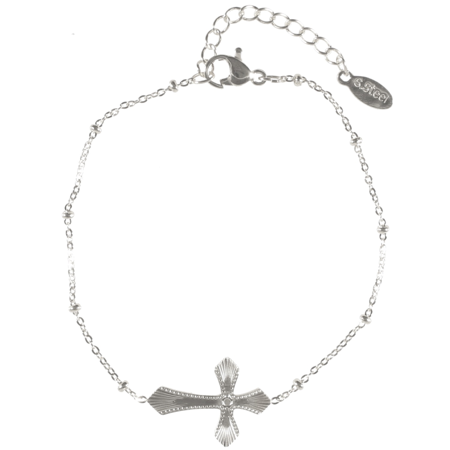 Description Bracelet composé d'une chaîne et d'une croix aux motifs en relief en acier argenté. Fermoir mousqueton avec une rallonge de 3 cm. Longueur 16+3 cm [Guide des tailles] Largeur 15 mm Matière(s) Acier . L'acier utilisé dans la bijouterie existe sous plusieurs qualités. Nous utilisons principalement la qualité 316L, qualité qui est utilisée en chirurgie. Cet acier est donc inoxydable et reste très résistant. Fermoir Mousqueton Couleur(s) dominante(s) Argenté Public Adolescent , Adulte . Genre Femme , Fille . Saison Indémodable . Thème(s) Religion . Collection AntiKa Cliquez sur une matière, un thème, une couleur ou une collection pour voir tous les articles associés.