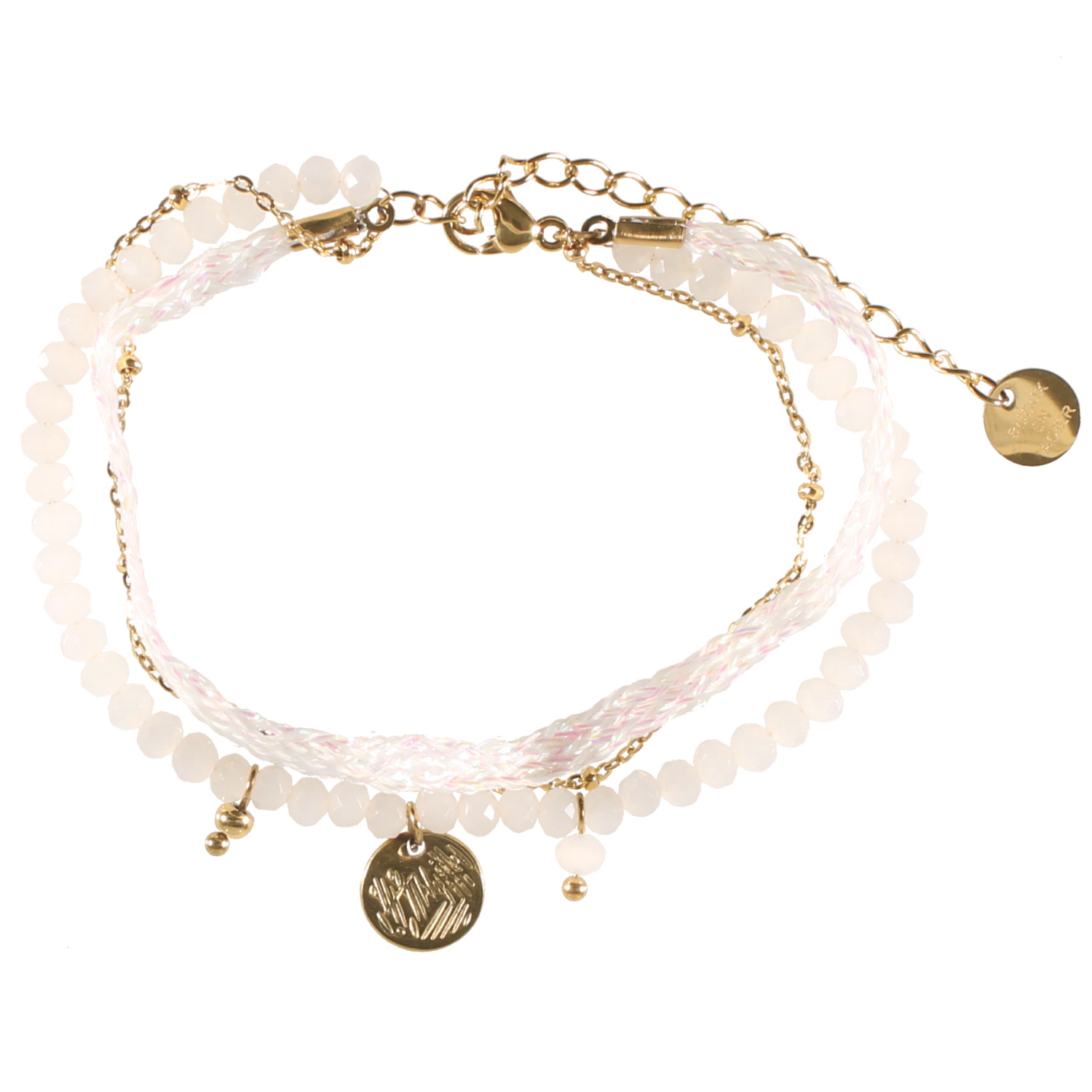 Bracelet triple rangs composé d'une chaîne en acier doré, d'un cordon en textile de couleur blanche, ainsi qu'un bracelet de perles de couleur blanche et d'une pastille ronde avec motifs en acier doré.