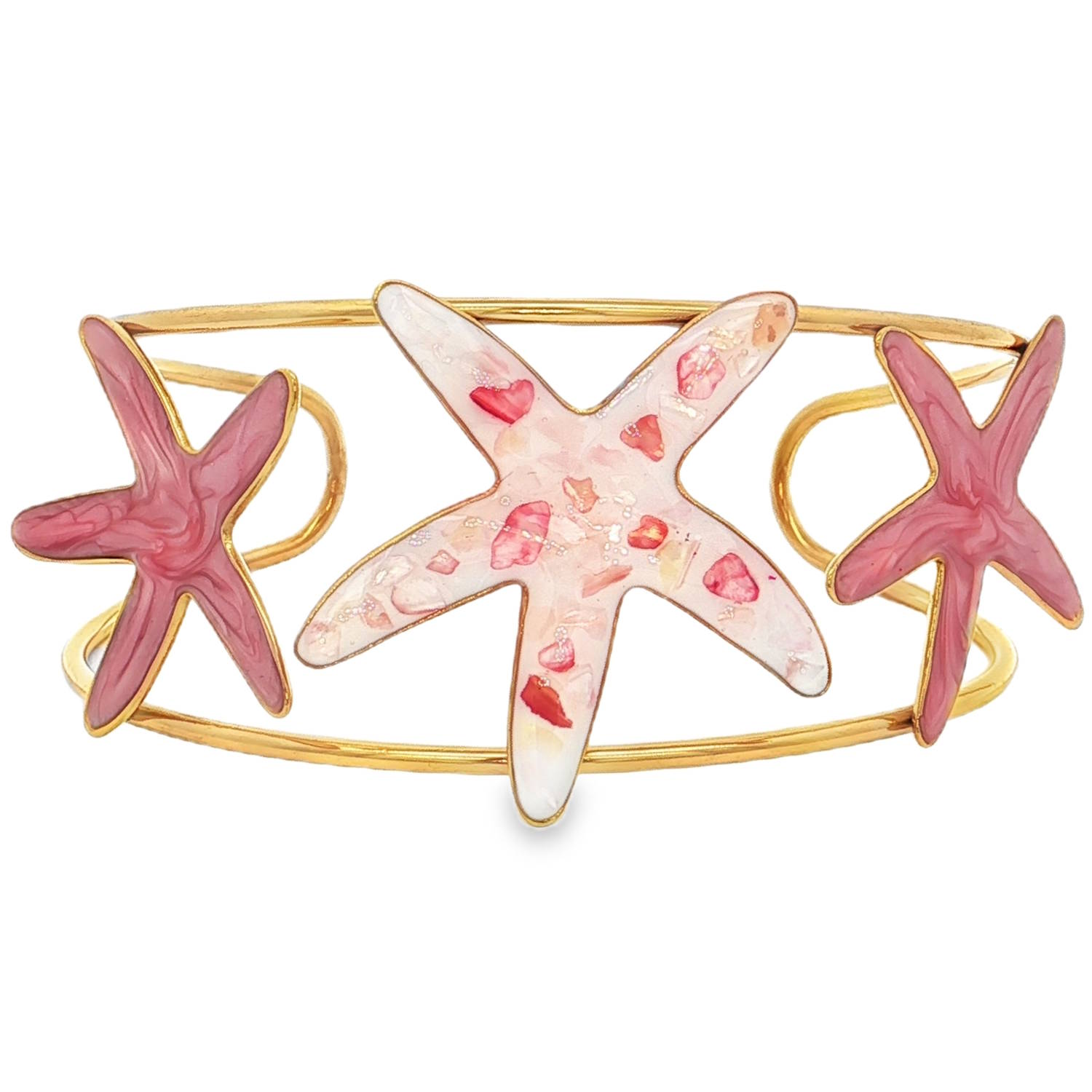 Une étoile de mer majestueuse ornée d'une marqueterie de nacre dans un dégradé de roses. Deux étoiles de mer plus petites encadrent la pièce centrale. Elles arborent une finition en émail rose avec des effets de marbrures rappelant le mouvement des vagues.