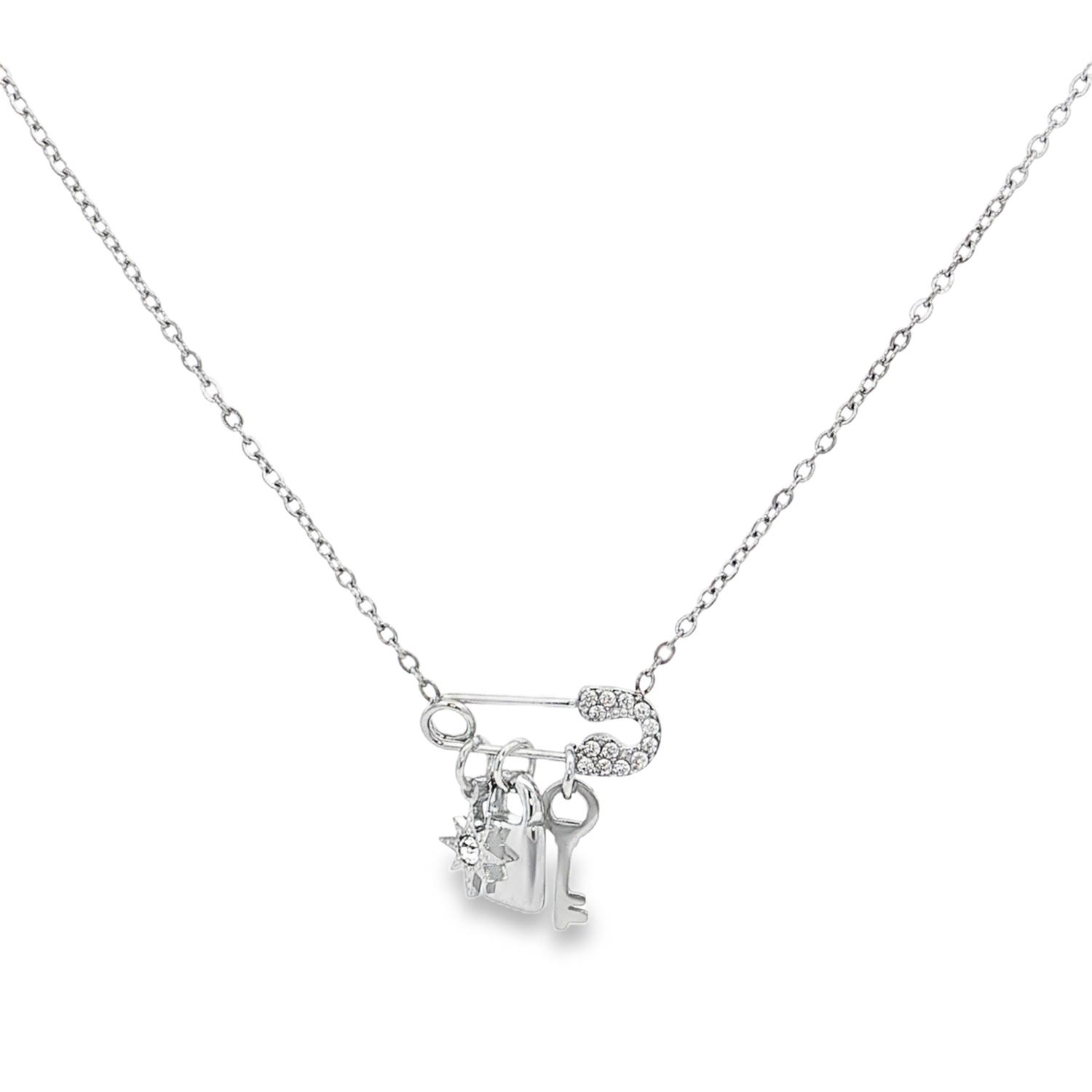 Apportez une note audacieuse et moderne à votre boîte à bijoux avec ce collier en acier inoxydable. Son design original met en scène une épingle à nourrice stylisée, servant de support à trois charms délicats qui dansent au gré de vos mouvements.