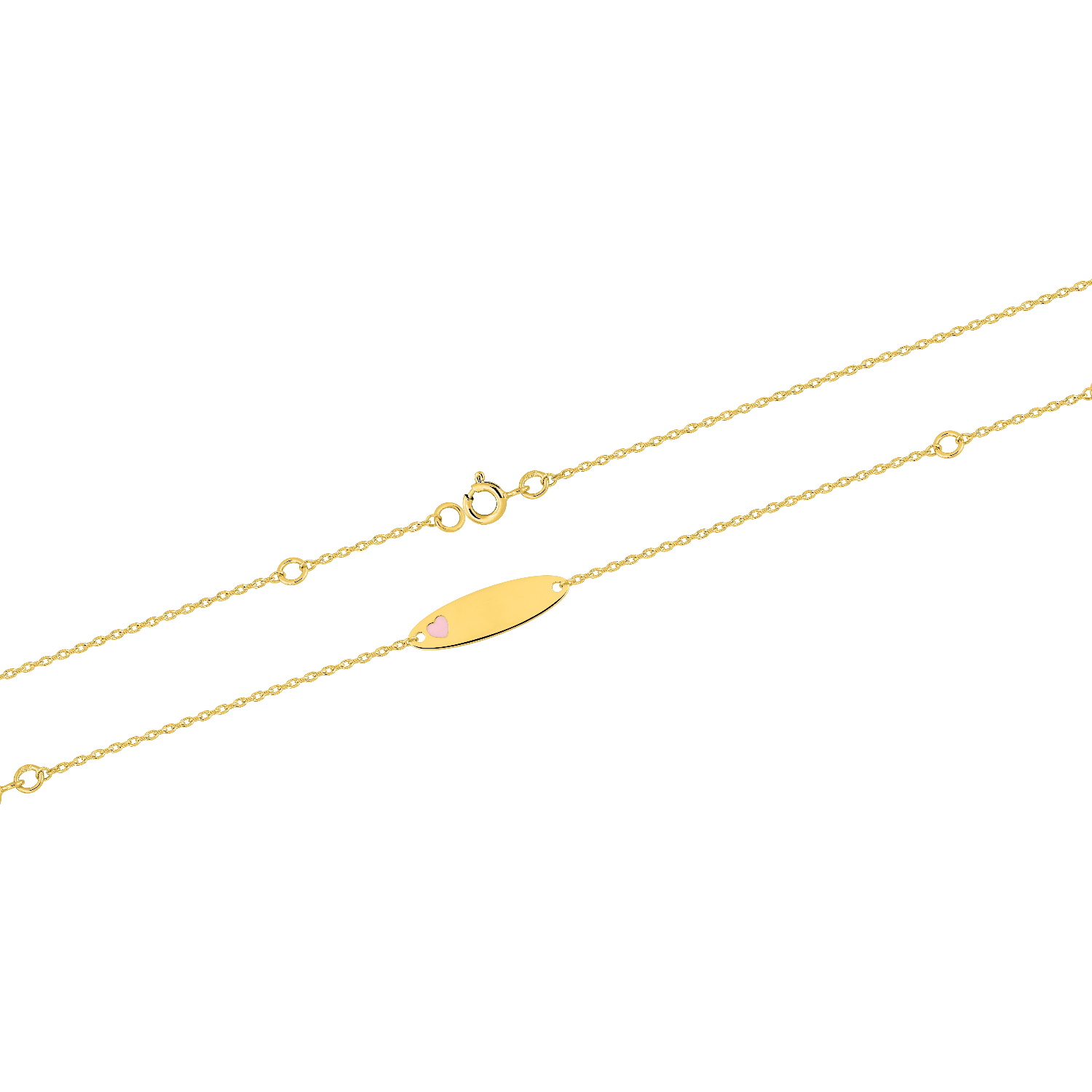 Magnifique bracelet gourmette  pour enfant en plaqué or jaune 18 carats.<br/>Cette chaîne présente une plaque personnalisable avec un cœur émaillé de rose<br/>Fermoir anneau ressort avec anneaux de rappel à 13 et 15 cm. Coeur  Adolescent Adulte Amour Enfant Fille Gravure Indémodable