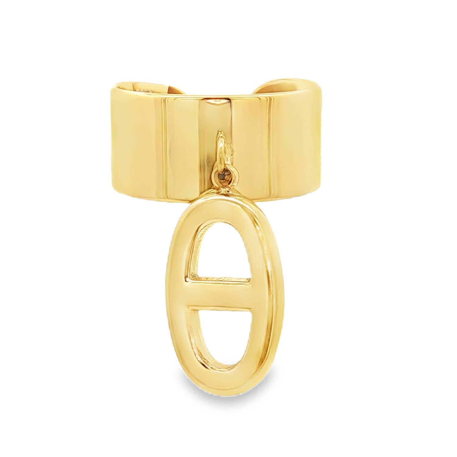 Cette bague se distingue par son anneau large et plat, affichant une finition dorée polie qui lui donne un éclat miroir sophistiqué. L'élément central est un pendentif mobile reprenant une forme ovale stylisée, traversée par une barre horizontale, rappelant subtilement les maillons de chaîne grain de café.