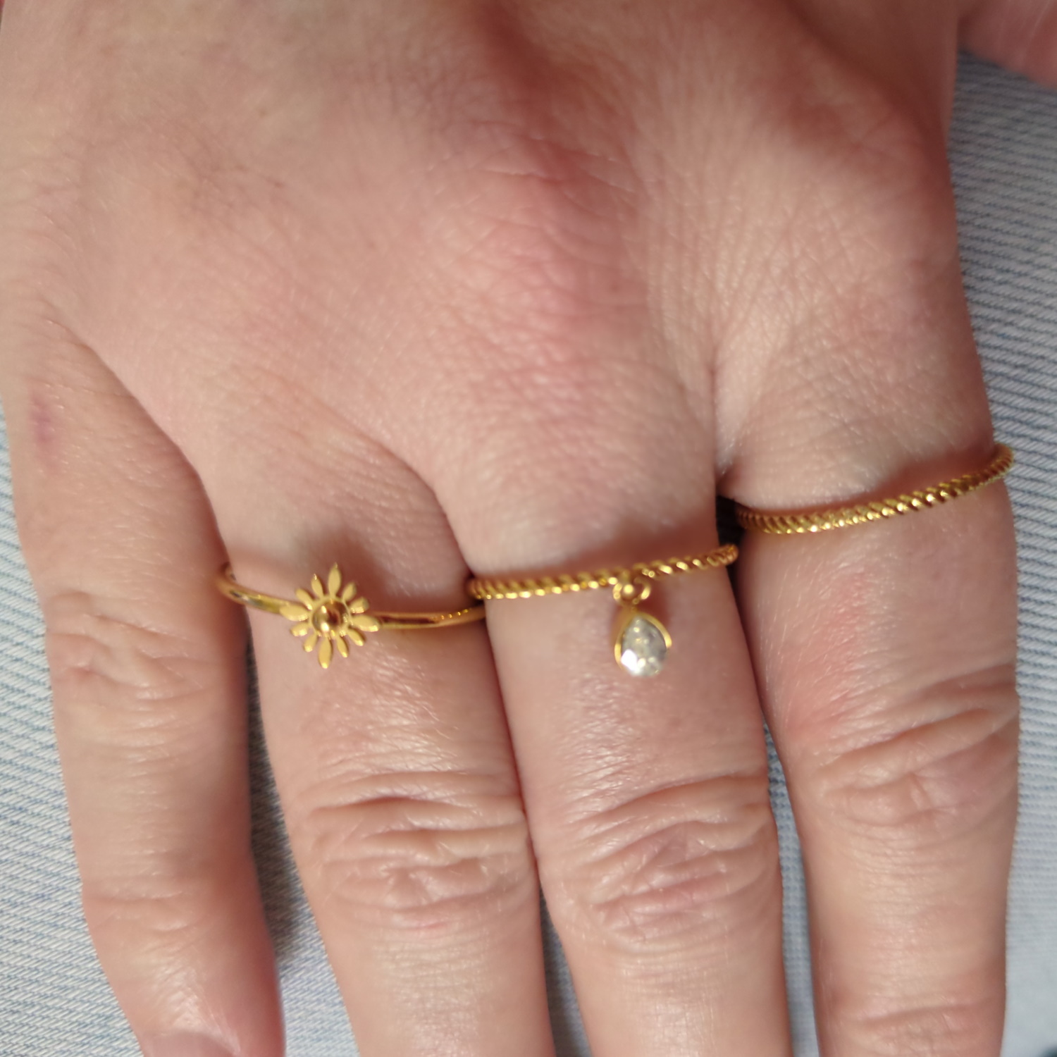 Description Lot de 3 bagues en acier doré dont une surmontée d'un soleil en acier doré et une avec un pendant en forme de goutte sertie d'un cristal. Taille ajustable. Largeur 15 mm Matière(s) Acier , Verre . L'acier utilisé dans la bijouterie existe sous plusieurs qualités. Nous utilisons principalement la qualité 316L, qualité qui est utilisée en chirurgie. Cet acier est donc inoxydable et reste très résistant. Fermoir Aucun Couleur(s) dominante(s) Doré Public Adolescent , Adulte . Genre Femme , Fille . Saison Indémodable . Thème(s) Nature . Cliquez sur une matière, un thème, une couleur ou une collection pour voir tous les articles associés.