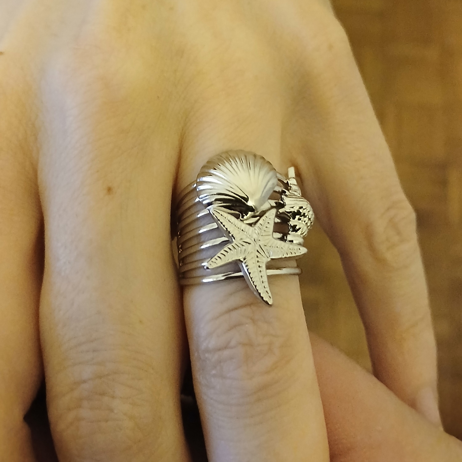 Description Bague surmontée de deux coquillages et d'une étoile de mer en acier argenté. Taille ajustable. Largeur 24 mm Matière(s) Acier . L'acier utilisé dans la bijouterie existe sous plusieurs qualités. Nous utilisons principalement la qualité 316L, qualité qui est utilisée en chirurgie. Cet acier est donc inoxydable et reste très résistant. Fermoir Aucun Couleur(s) dominante(s) Argenté Public Adolescent , Adulte . Genre Femme , Fille . Saison Indémodable . Thème(s) Animaux , Nature . Cliquez sur une matière, un thème, une couleur ou une collection pour voir tous les articles associés.