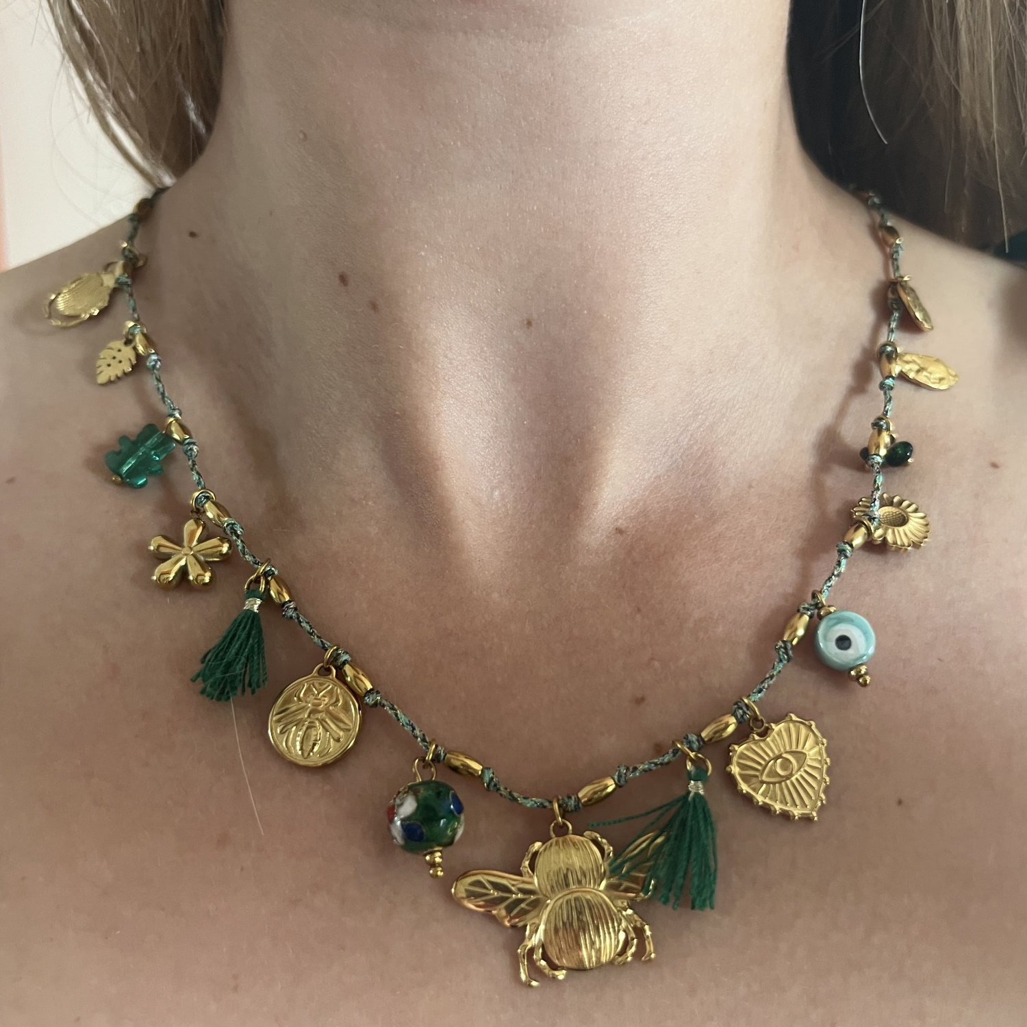 Description Collier composé d'un cordon multicolore finissant par des pompons, des perles en acier doré, des breloques scarabée, feuille, fleurs, cœur avec œil de Turquie, pastilles rondes et ovales martelées et une guêpe en acier doré, d'une perle avec motifs de fleur en émail, d'un nounours en cristal et d'un œil de Turquie. Longueur 36/60 cm [Guide des tailles] Largeur 20 mm Matière(s) Acier , Email , Rocaille , Textile , Verre . L'acier utilisé dans la bijouterie existe sous plusieurs qualités. Nous utilisons principalement la qualité 316L, qualité qui est utilisée en chirurgie. Cet acier est donc inoxydable et reste très résistant. Fermoir Noeud coulissant Couleur(s) dominante(s) Doré , Vert Public Adolescent , Adulte . Genre Femme , Fille . Saison Indémodable . Thème(s) Amour , Animaux , Fleurs , Nature , Symboles . Cliquez sur une matière, un thème, une couleur ou une collection pour voir tous les articles associés.