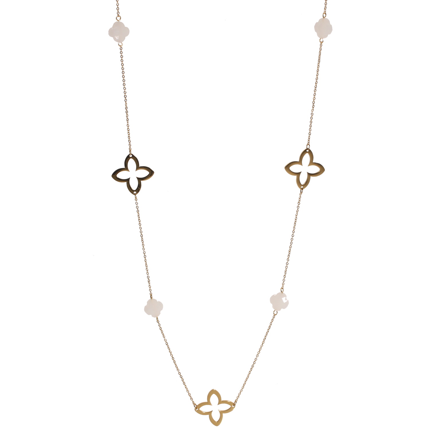 Description Collier sautoir composé d'une chaîne avec trèfle en acier doré et de trèfles de couleur blanche. Fermoir mousqueton avec 5 cm de rallonge. Cliquez sur une matière, un thème, une couleur ou une collection pour voir tous les articles associés.
