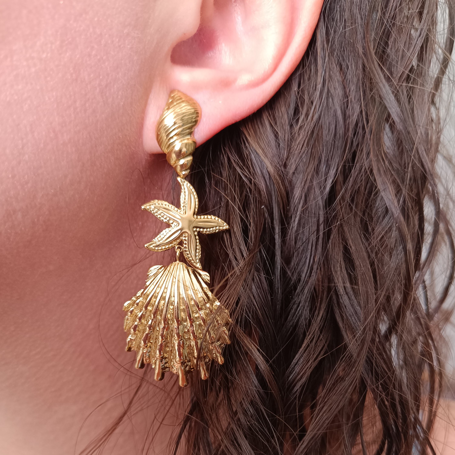 Description Boucles d'oreilles pendantes en forme de coquillages et d'étoile de mer en acier doré. Largeur 28 mm Hauteur 70 mm Matière(s) Acier . L'acier utilisé dans la bijouterie existe sous plusieurs qualités. Nous utilisons principalement la qualité 316L, qualité qui est utilisée en chirurgie. Cet acier est donc inoxydable et reste très résistant. Fermoir Tiges poussettes Couleur(s) dominante(s) Doré Public Adolescent , Adulte . Genre Femme , Fille . Saison Indémodable . Thème(s) Nature . Cliquez sur une matière, un thème, une couleur ou une collection pour voir tous les articles associés.
