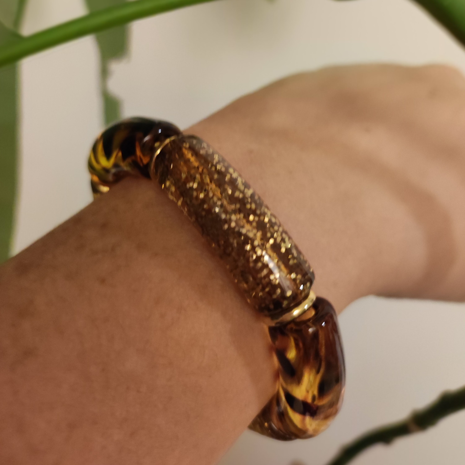 Description Bracelet fantaisie élastique composé de rondelles en acier doré et de tubes de couleur marron et avec des paillettes. Cliquez sur une matière, un thème, une couleur ou une collection pour voir tous les articles associés.