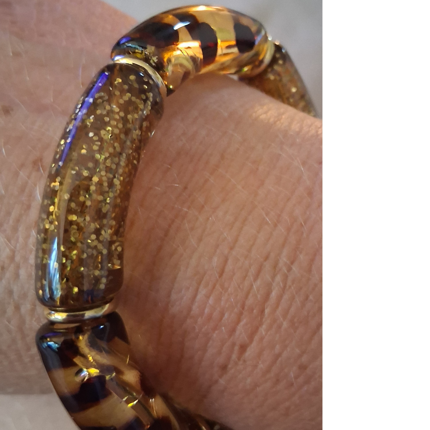 Description Bracelet fantaisie élastique composé de rondelles en acier doré et de tubes de couleur marron et avec des paillettes. Cliquez sur une matière, un thème, une couleur ou une collection pour voir tous les articles associés.