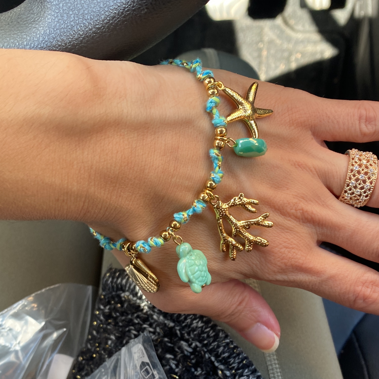 Bracelet composé d'un cordon bleu, de perles en acier doré, de pendants en forme d'étoile de mer, d'algue et de coquillage en acier doré, d'une perle turquoise et d'une tortue turquoise. Fermoir mousqueton en acier doré avec 3 cm de rallonge.