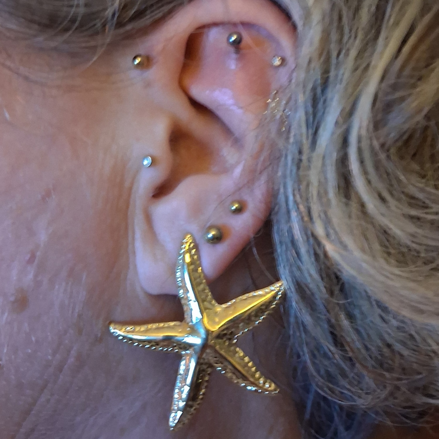 Description Boucles d'oreilles pendantes en forme d'étoile de mer en acier chirurgical 316L doré. Largeur 38 mm Hauteur 40 mm Matière(s) Acier . L'acier utilisé dans la bijouterie existe sous plusieurs qualités. Nous utilisons principalement la qualité 316L, qualité qui est utilisée en chirurgie. Cet acier est donc inoxydable et reste très résistant. Fermoir Tiges poussettes Couleur(s) dominante(s) Doré Public Adolescent , Adulte . Genre Femme , Fille . Saison Indémodable . Thème(s) Animaux , Nature . Rayon en magasin L109 Cliquez sur une matière, un thème, une couleur ou une collection pour voir tous les articles associés.
