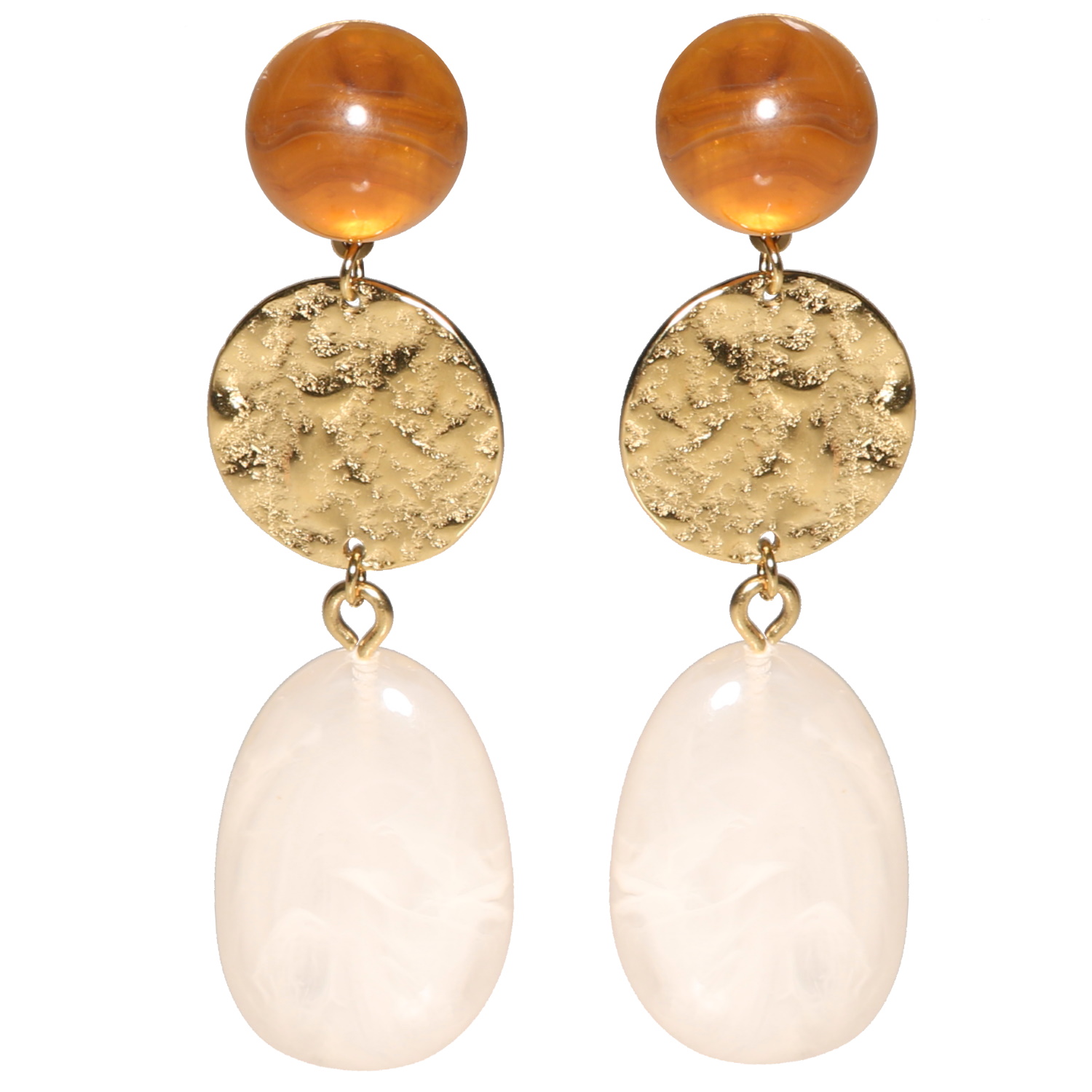 Description Boucles d'oreilles pendantes composées d'un cabochon en pierre d'ambre d'imitation, d'une pastille ronde martelée en acier doré et d'une pierre ovale de couleur blanche. Largeur 17 mm Hauteur 60 mm Matière(s) Acier , Pierre synthétique , Résine . L'acier utilisé dans la bijouterie existe sous plusieurs qualités. Nous utilisons principalement la qualité 316L, qualité qui est utilisée en chirurgie. Cet acier est donc inoxydable et reste très résistant. Fermoir Tiges poussettes Couleur(s) dominante(s) Blanc , Doré , Marron Public Adolescent , Adulte . Genre Femme , Fille . Saison Indémodable . Cliquez sur une matière, un thème, une couleur ou une collection pour voir tous les articles associés.