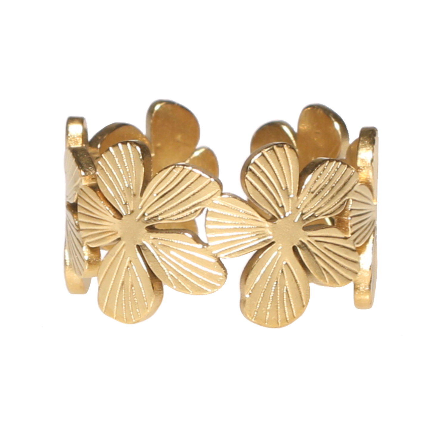 Description Bague composée de fleurs en acier doré. Taille ajustable. Largeur 12 mm Matière(s) Acier . L'acier utilisé dans la bijouterie existe sous plusieurs qualités. Nous utilisons principalement la qualité 316L, qualité qui est utilisée en chirurgie. Cet acier est donc inoxydable et reste très résistant. Fermoir Aucun Couleur(s) dominante(s) Doré Public Adolescent , Adulte . Genre Femme , Fille . Saison Indémodable . Thème(s) Fleurs , Nature . Cliquez sur une matière, un thème, une couleur ou une collection pour voir tous les articles associés.